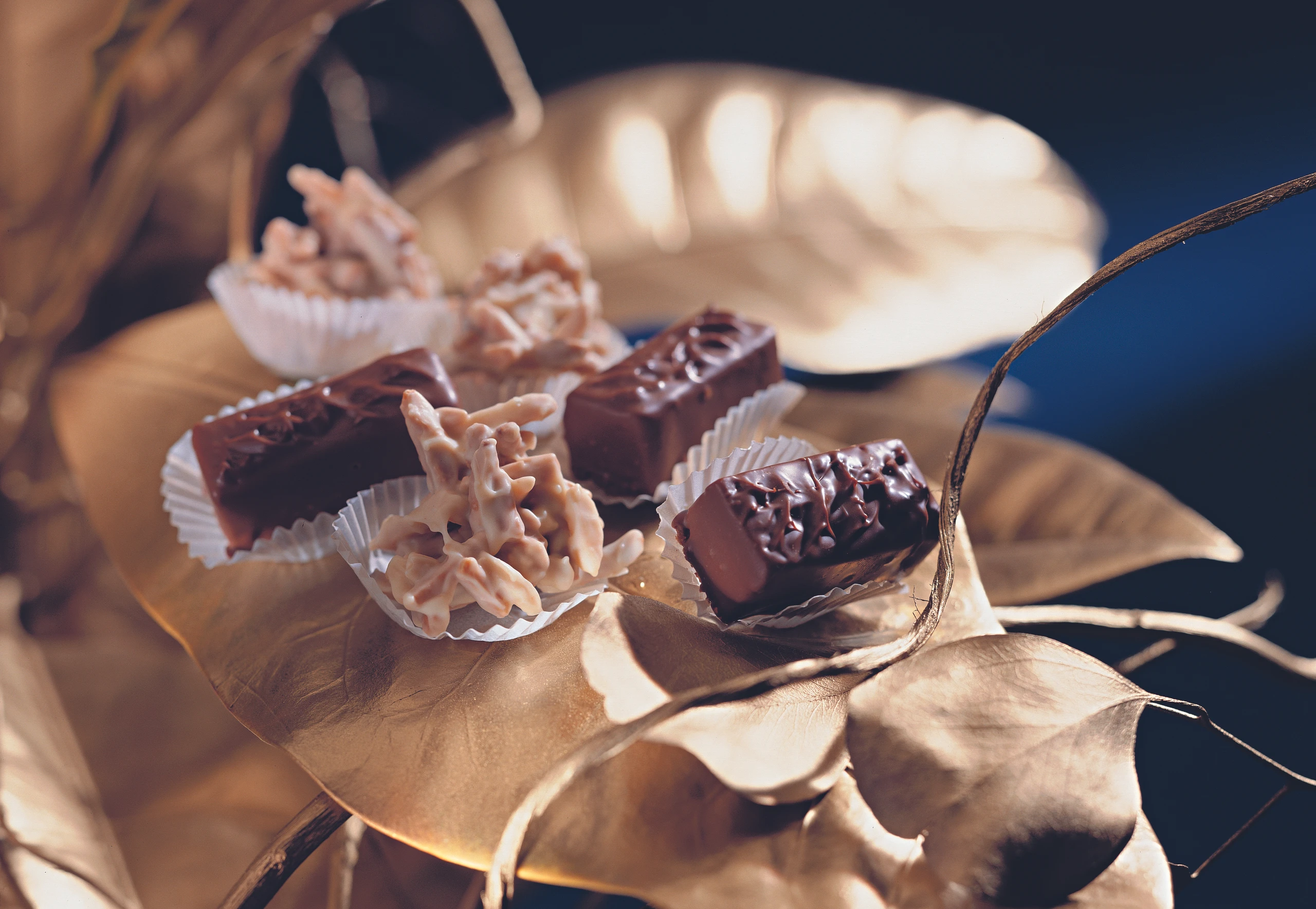 Krokantstreifen zum Festwerden der Glasur kalt stellen. Anschließend die Krokantstreifen vom Papier lösen und in Papiermanschetten setzen. Kühl und luftdicht aufbewahren!