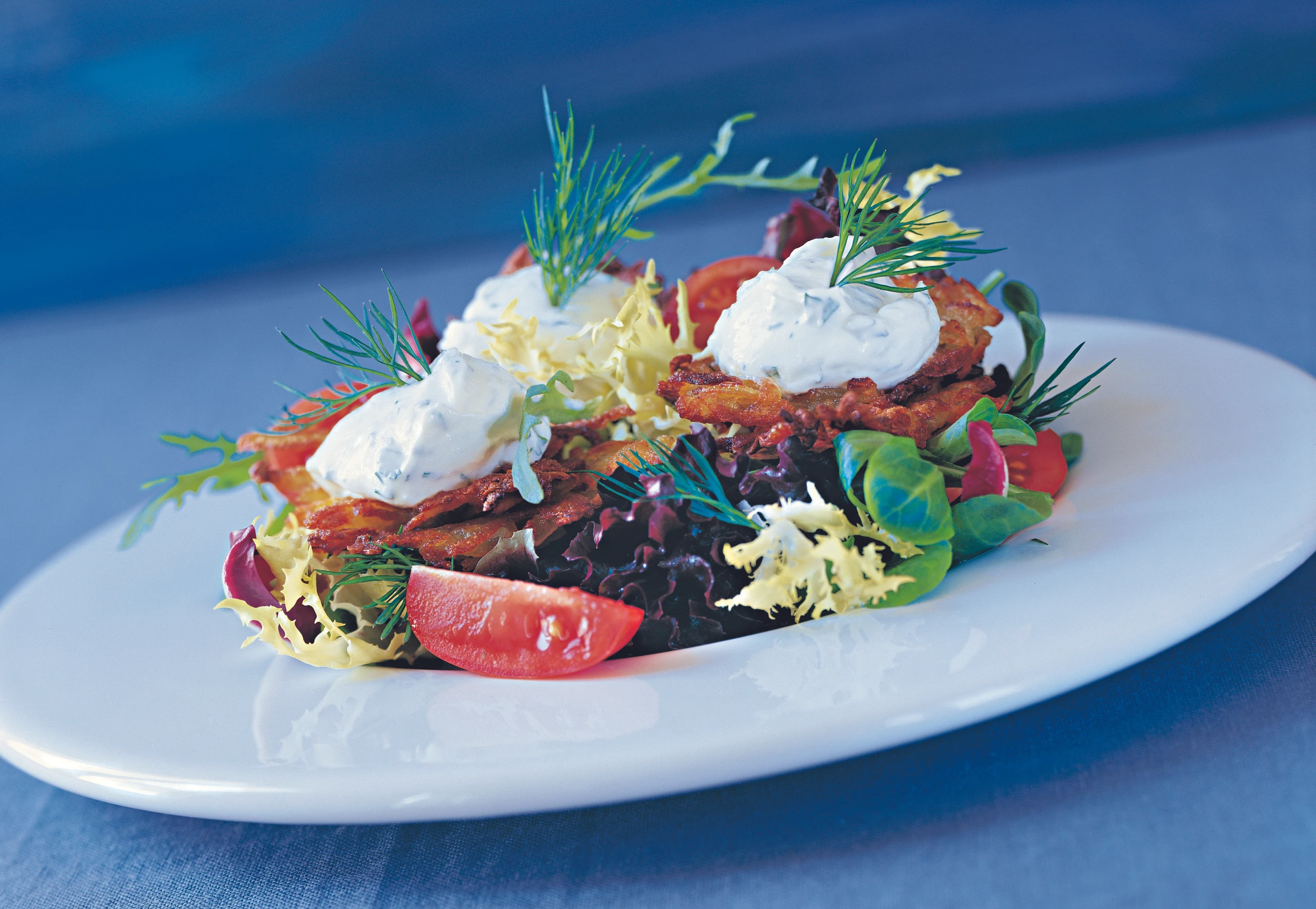 Salate, Paradeiser und Kräuter mit der Marinade vermischen und anrichten. Rösti darauf setzen und mit Le Tartare Kräuter-Leicht garniert servieren.