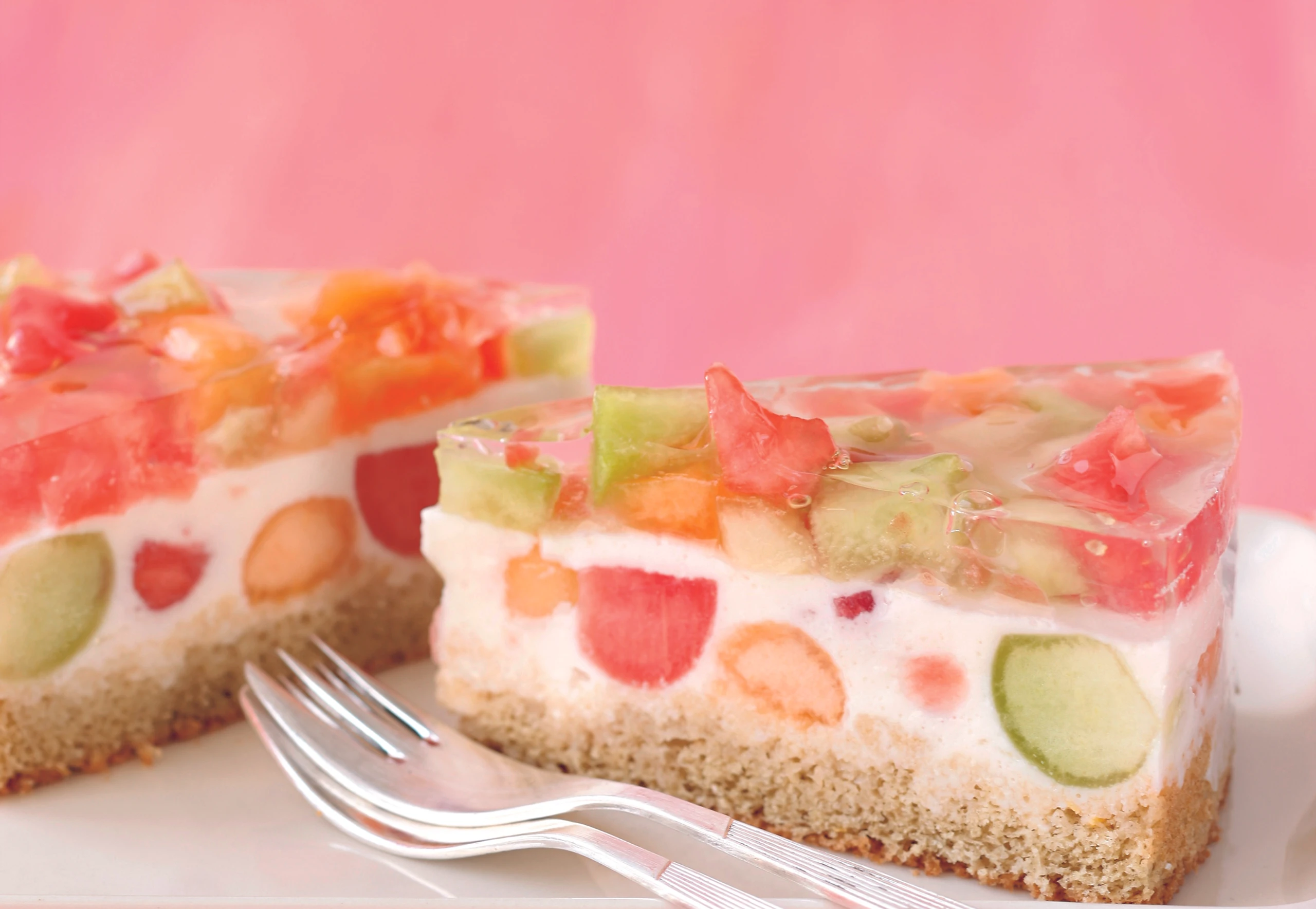 Für die Garnitur übrige Melonen schälen und die Kerne entfernen. Fruchtfleisch in ca. 1 cm große Würfel schneiden. Tortengelee laut Packungsanleitung zubereiten. Melonenstücke auf der Torte verteilen, Gelee darüber gießen und gleichmäßig verstreichen. Torte für ca. 30 Minuten kühl stellen.