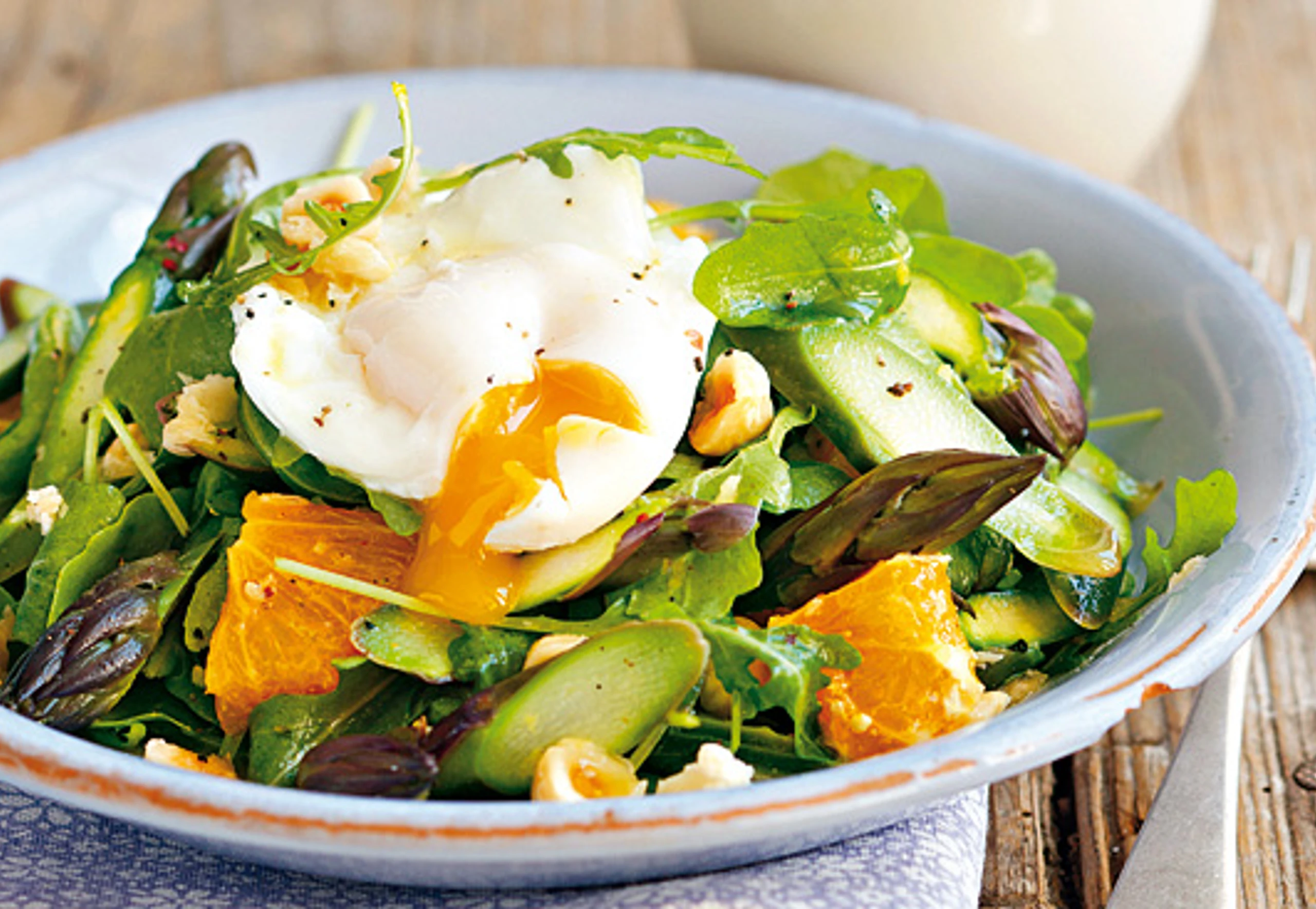 Inzwischen Spargel mit Rucola und Orangen anrichten. Eier gut abtropfen lassen und auf den Salat setzen. Mit Haselnüssen bestreut servieren.