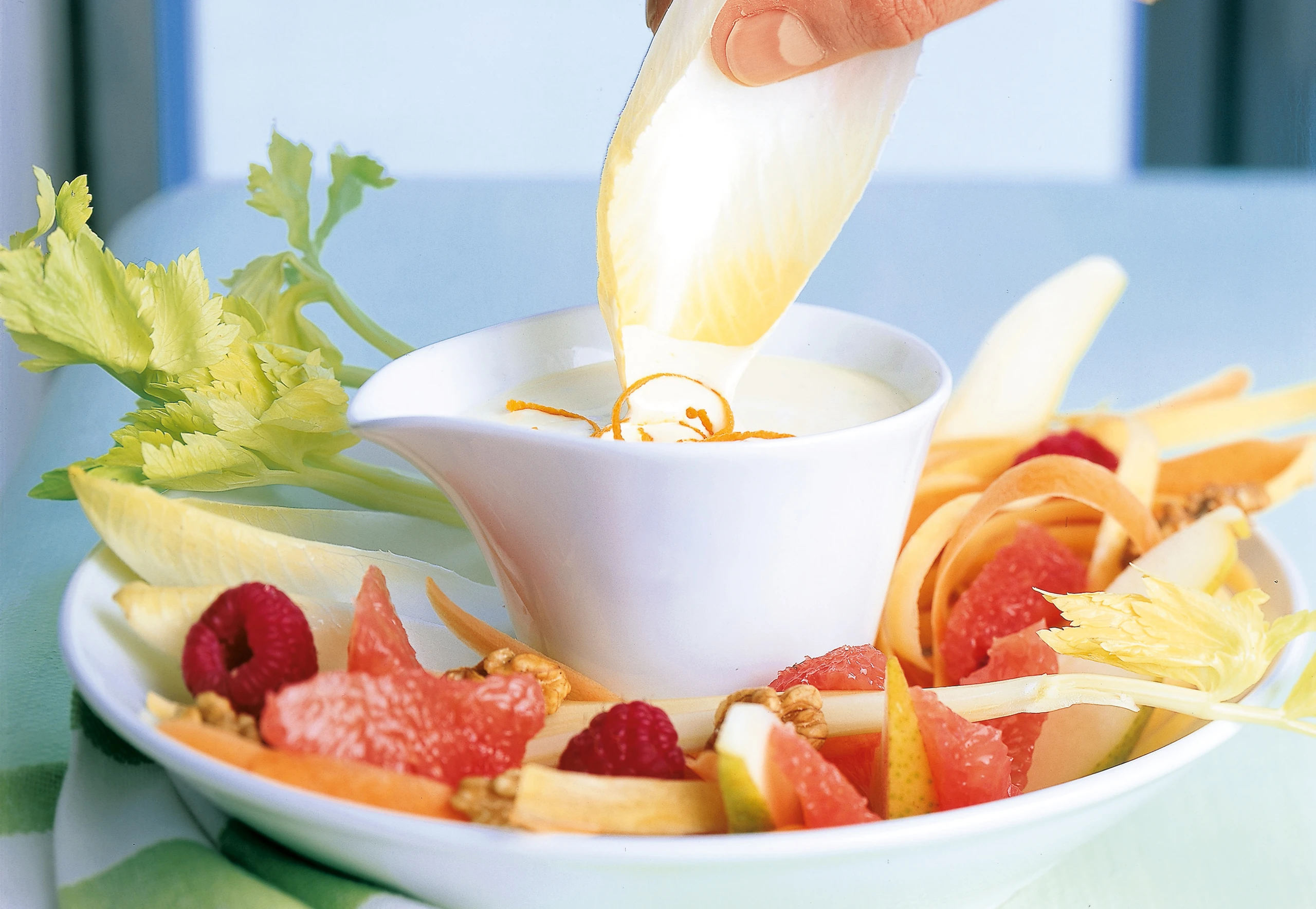 Früchte und Gemüse (bis auf den Chicoree) behutsam mit dem Dressing vermischen. Salat mit den Chicoreeblättern garniert servieren.