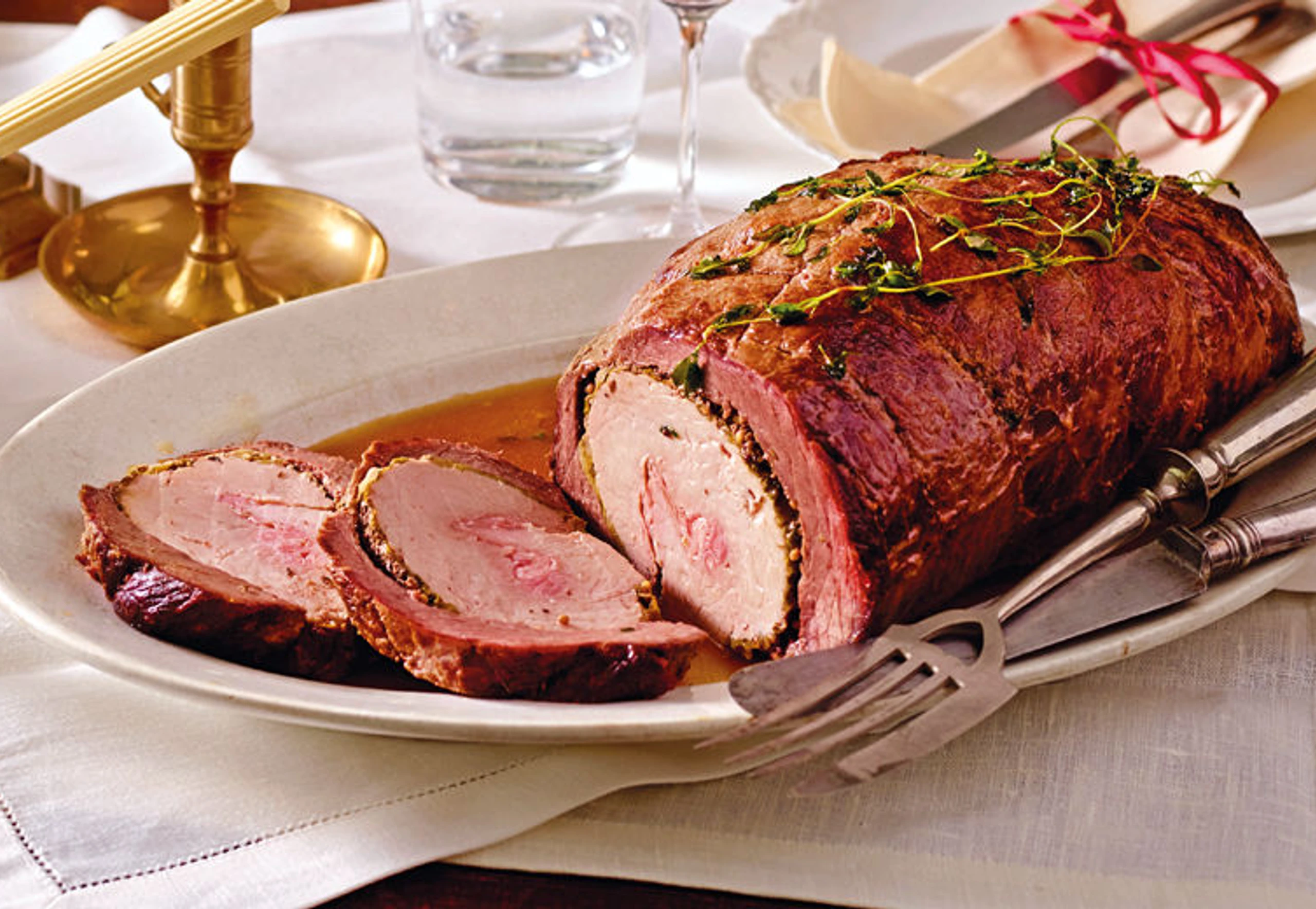 Rohr auf 180°C vorheizen. Beiried mit Salz, Pfeffer und Thymian würzen, mit der Hälfte von der Senfmischung bestreichen und mit den Kohlblättern belegen. Kalbfleisch darauf legen, mit der übrigen Senfmischung und den Schinkenblättern belegen. Fleisch möglichst eng einrollen, mit Spagat binden. Rundum salzen und pfeffern.