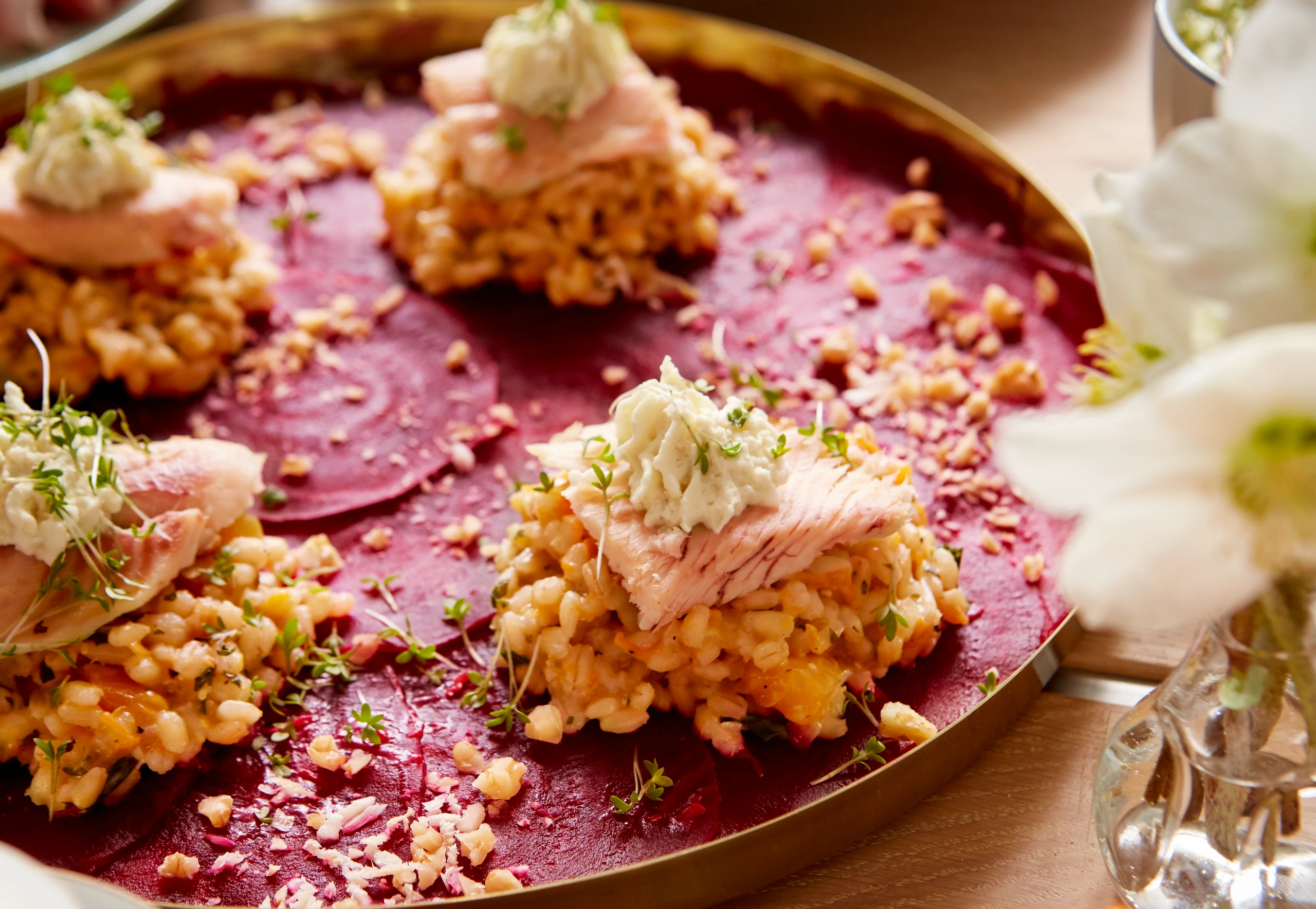 Rollgersten-Risotto mit Räucherforelle und Rote-Rüben-Carpaccio