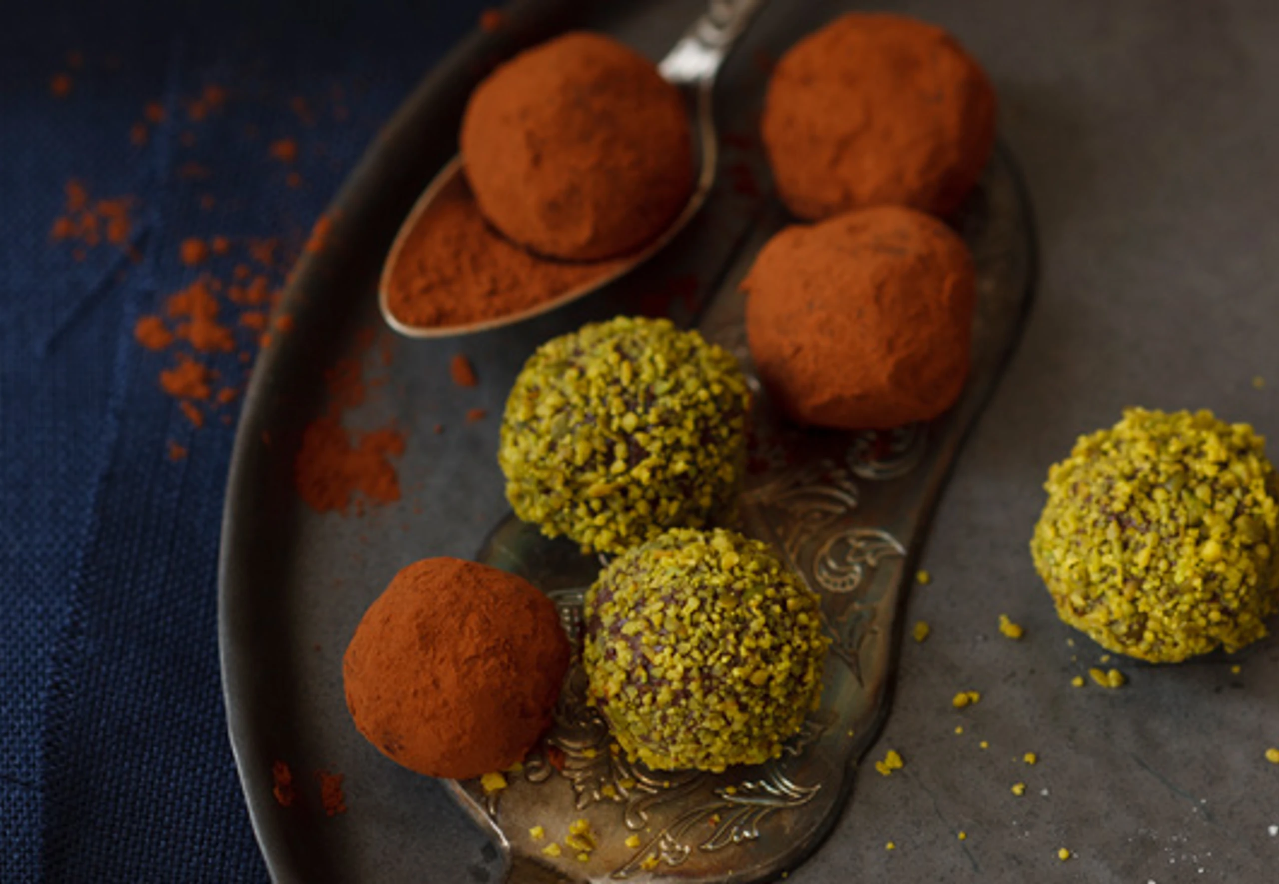 Aus der Schokomasse kleine Kugeln formen, zur Hälfte in Kakao und Pistazien wälzen.