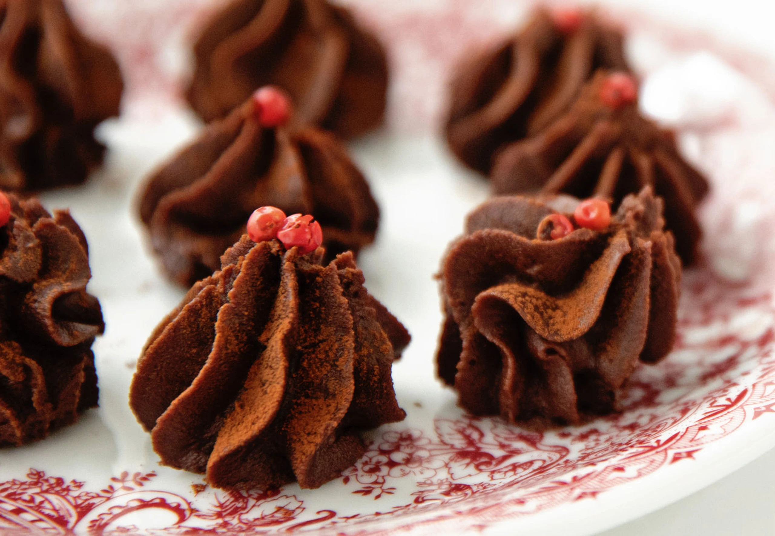 Schokomasse kurz aufrühren, in einen Dressiersack mit Sterntülle füllen und Spitzen auf Backpapier dressieren. Spitzen kalt stellen. Vor dem Servieren mit Kakao bestreuen und mit Rosa Pfeffer verzieren.