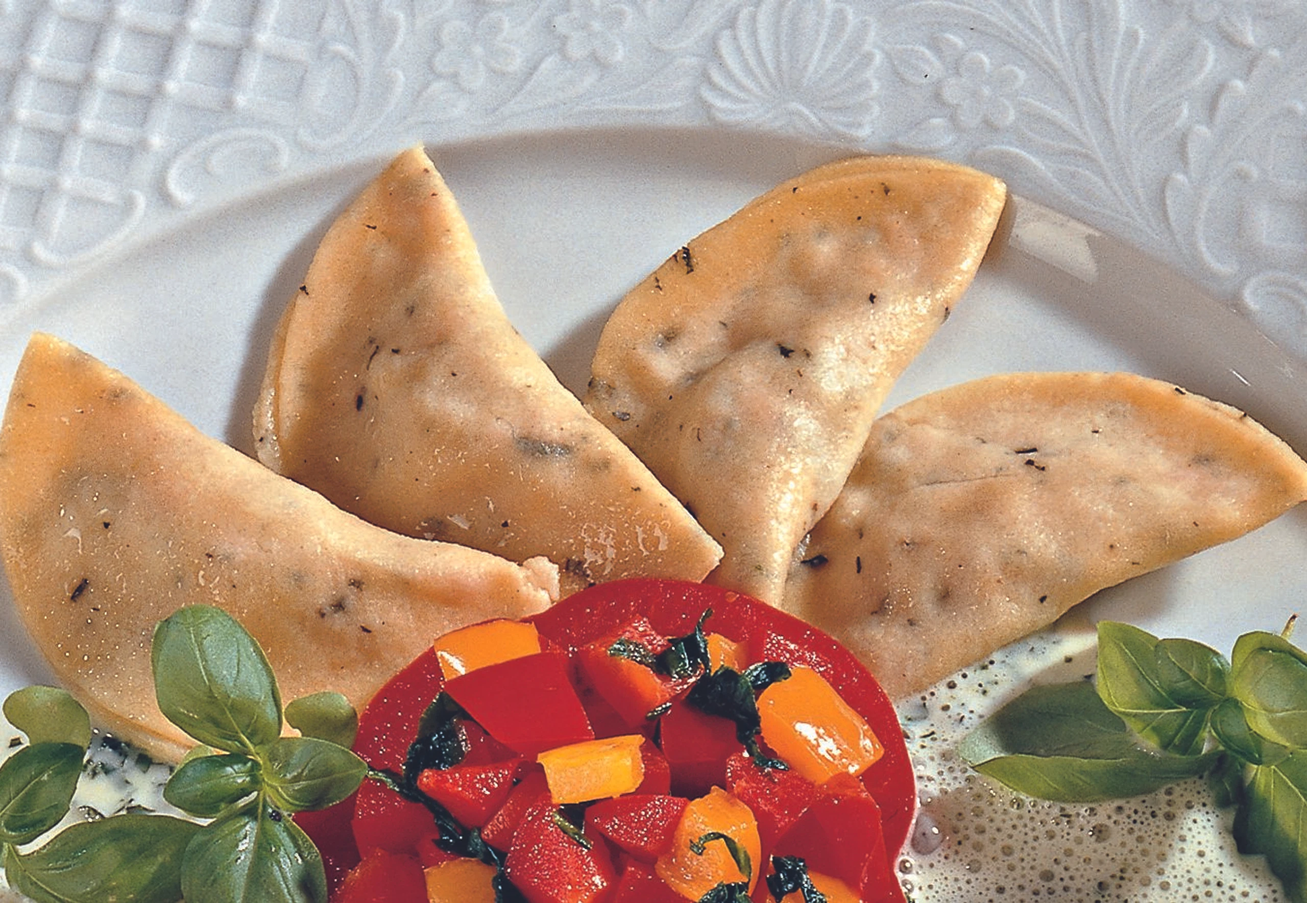Nudelteig auf einer bemehlten Arbeitsfläche dünn ausrollen, aus dem Teig 16 Scheiben mit Ø ca. 8 cm ausstechen. In die Mitte jeder Teigscheibe ein wenig Fülle setzen. Teig über die Fülle klappen und die Ränder gut zusammendrücken.