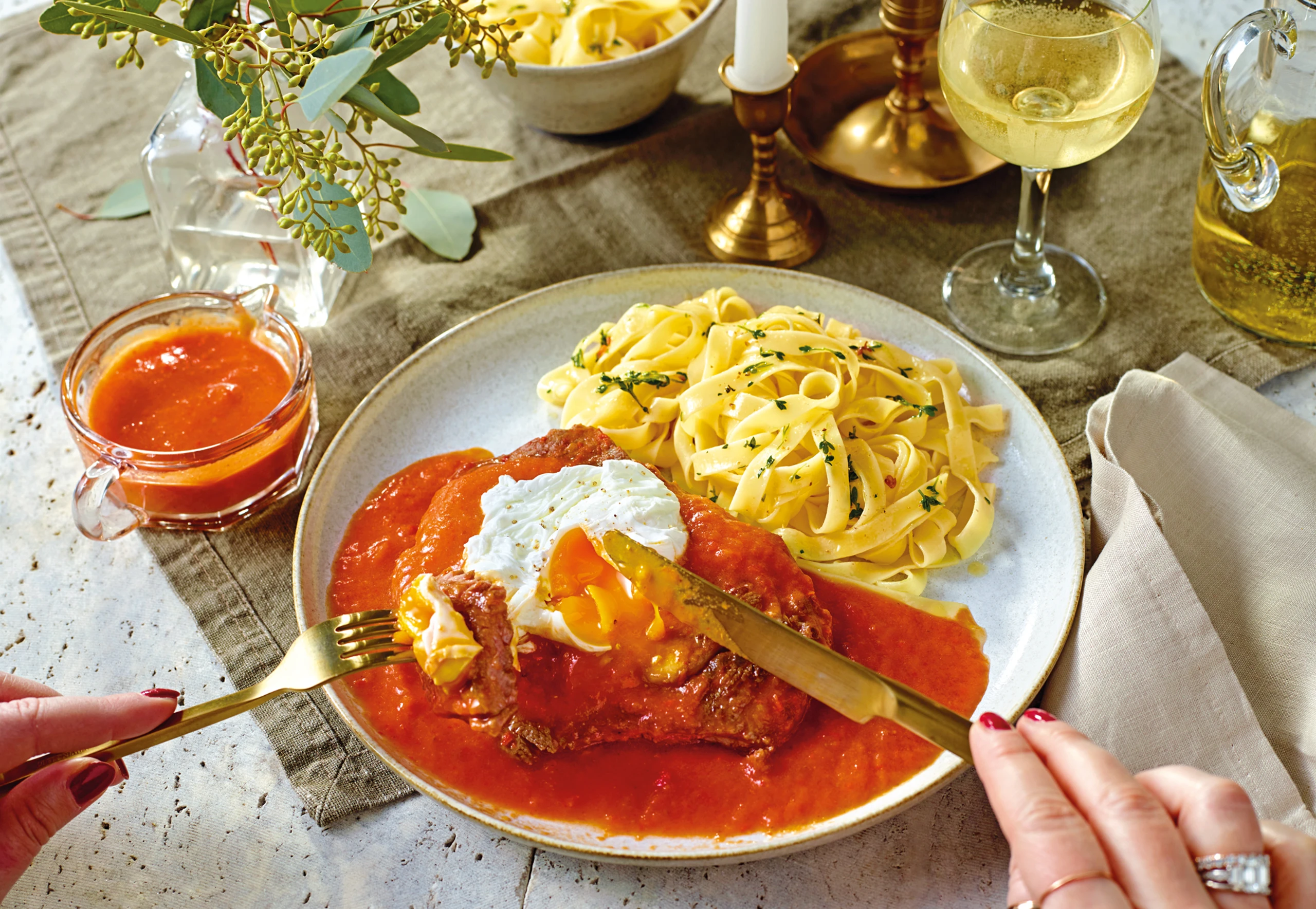 Rostbraten mit Paprikasauce, pochiertem Ei und Tagliatelle