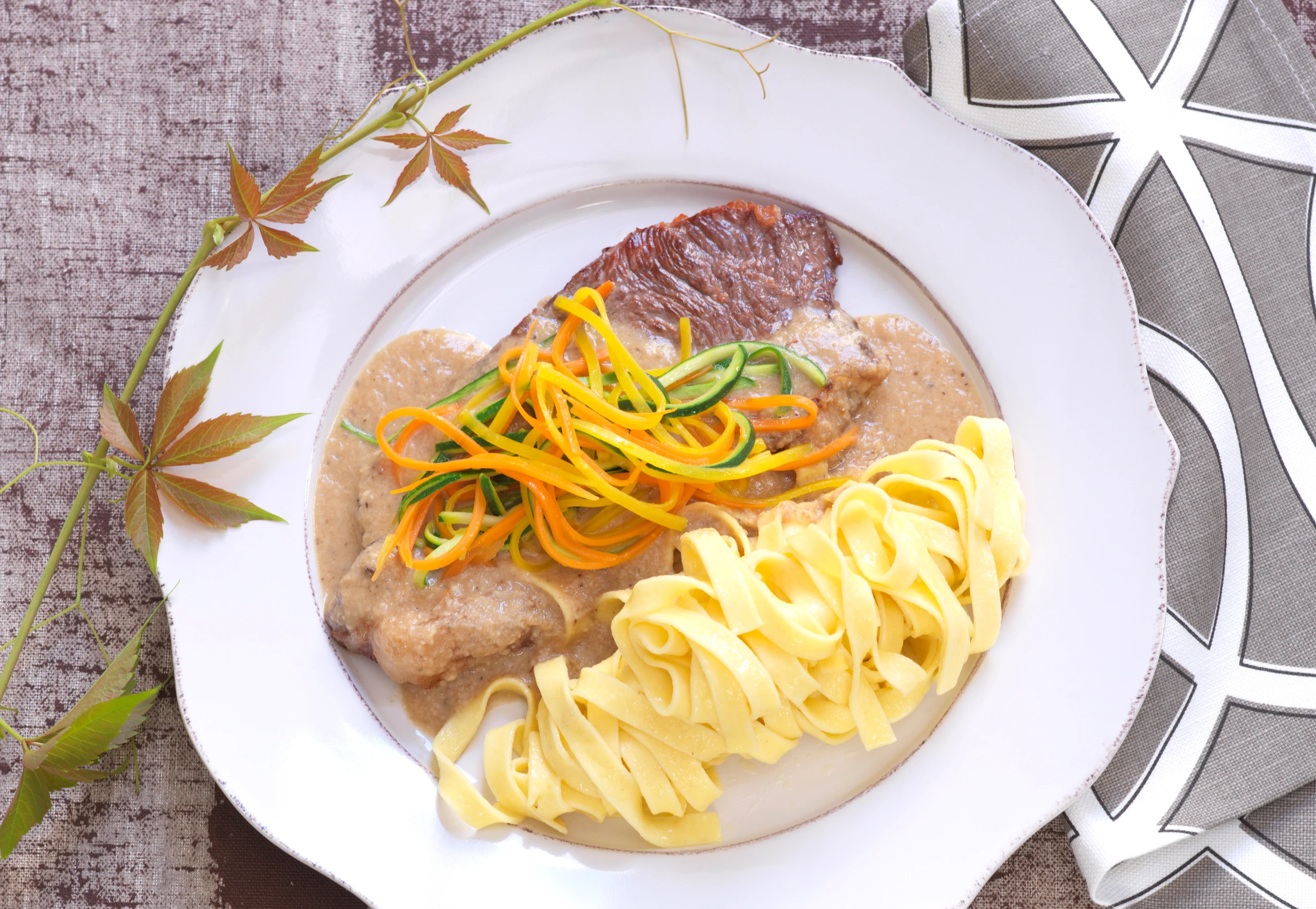 Parallel dazu Salzwasser aufkochen, Tagliatelle darin bissfest kochen. Tagliatelle abseihen, in aufgeschäumter Butter schwenken, mit Salz und Pfeffer würzen. Fleisch mit Sauce, Gemüse und Tagliatelle anrichten.