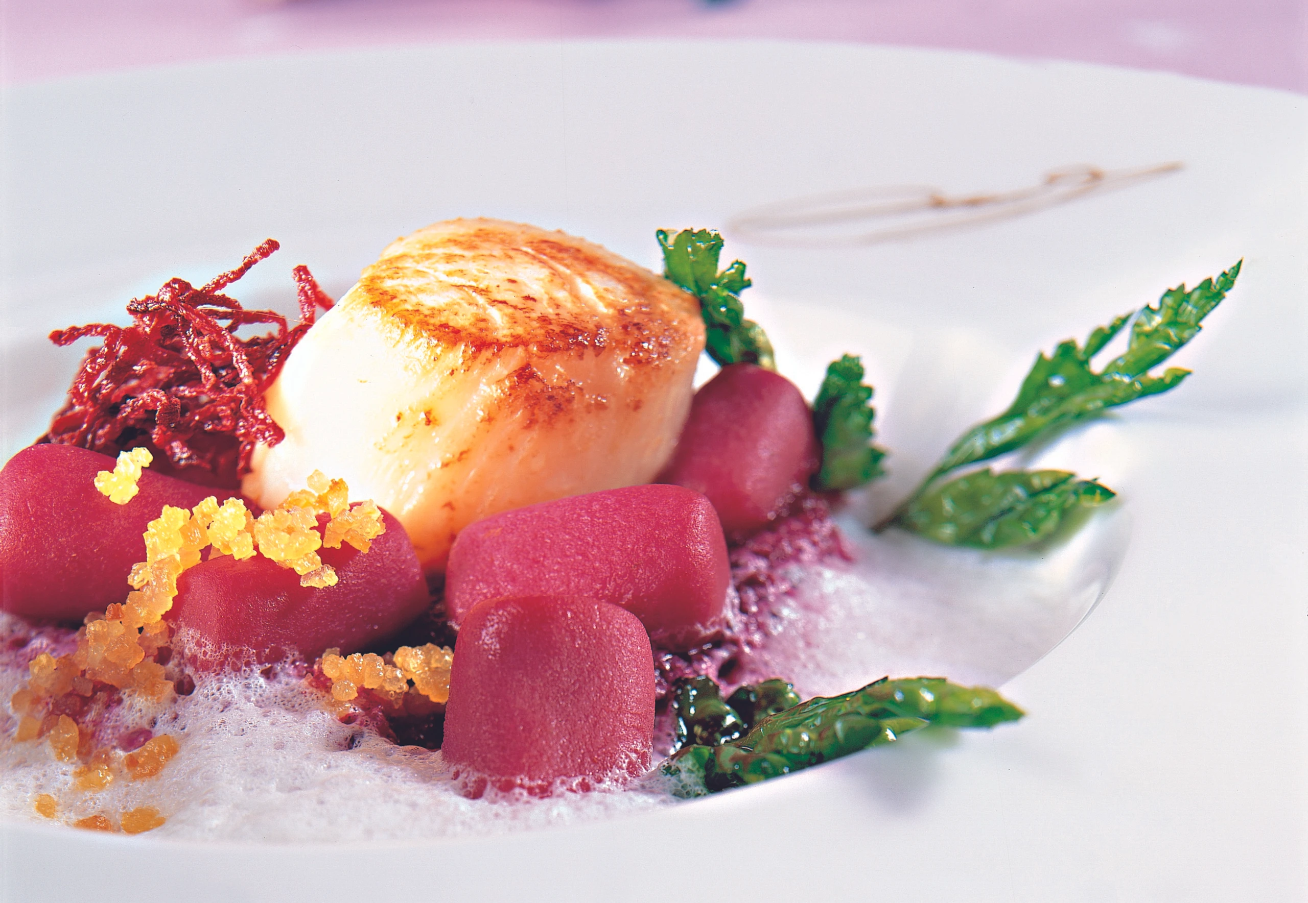 Rote Gnocchi mit Jakobsmuscheln und Krenschaum