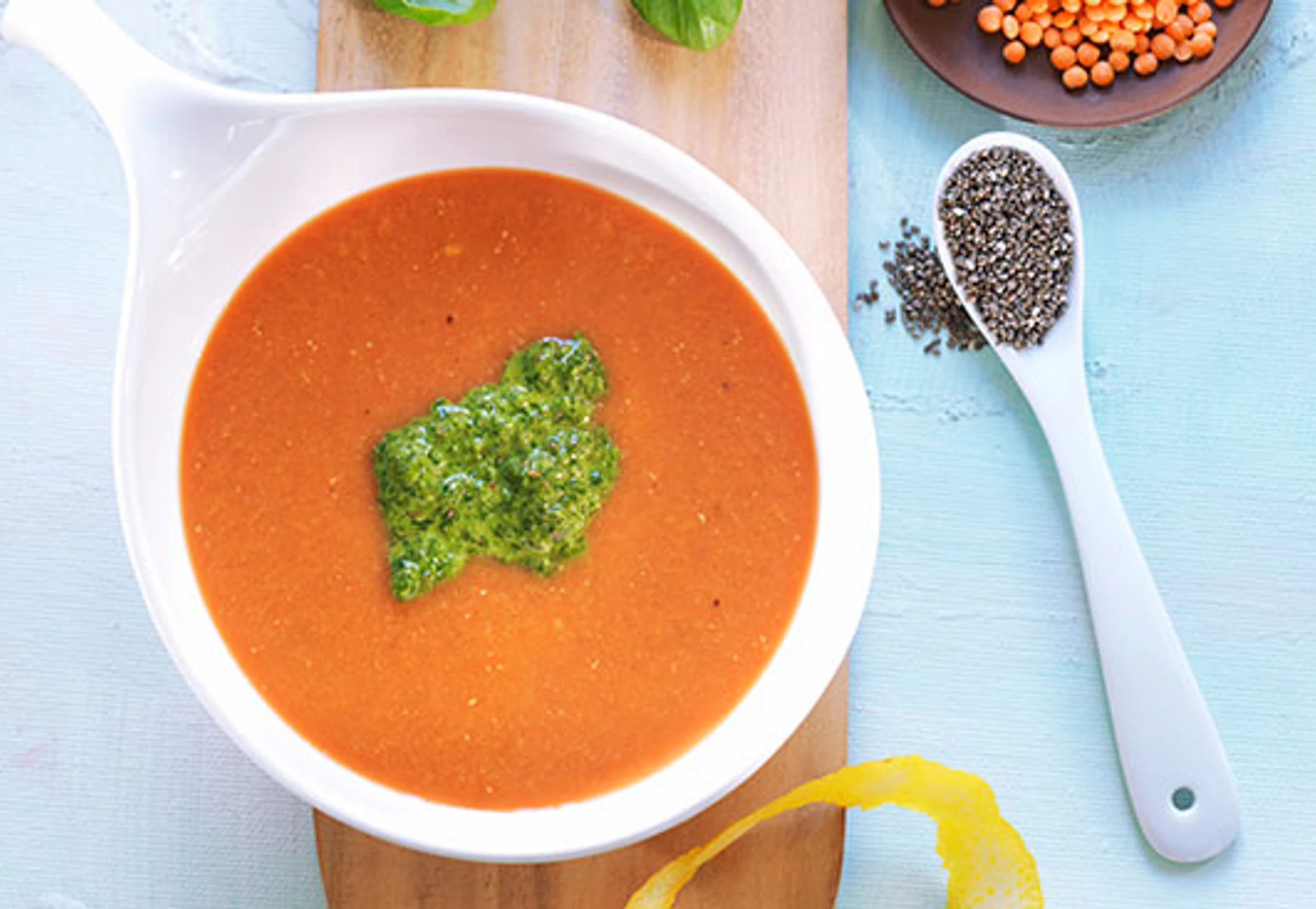 - Suppe fein pürieren. Suppenpulver und Paradeissaft einrühren. Suppe noch kurz köcheln, mit Salz und Pfeffer abschmecken, portionsweise mit dem Chia-Kräuter-Pesto servieren.