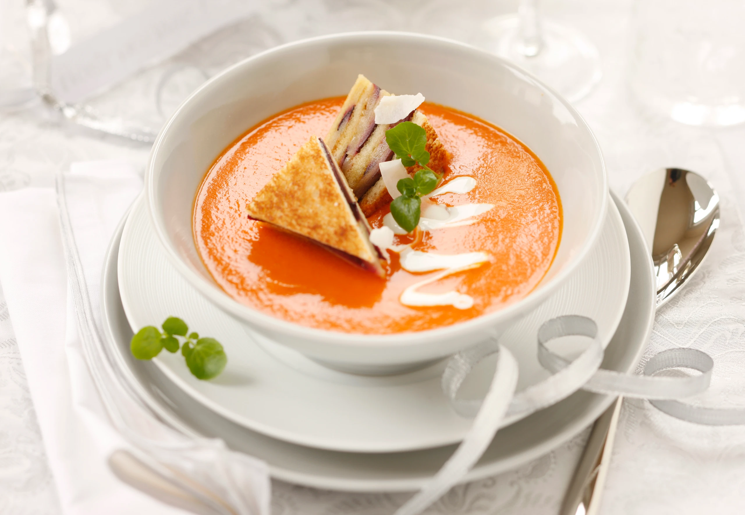 - Kokoscreme erwärmen. Suppe aufkochen, anrichten und mit der Kokoscreme beträufeln. Suppe mit Brotecken, Kokosflocken und Kresse garnieren.