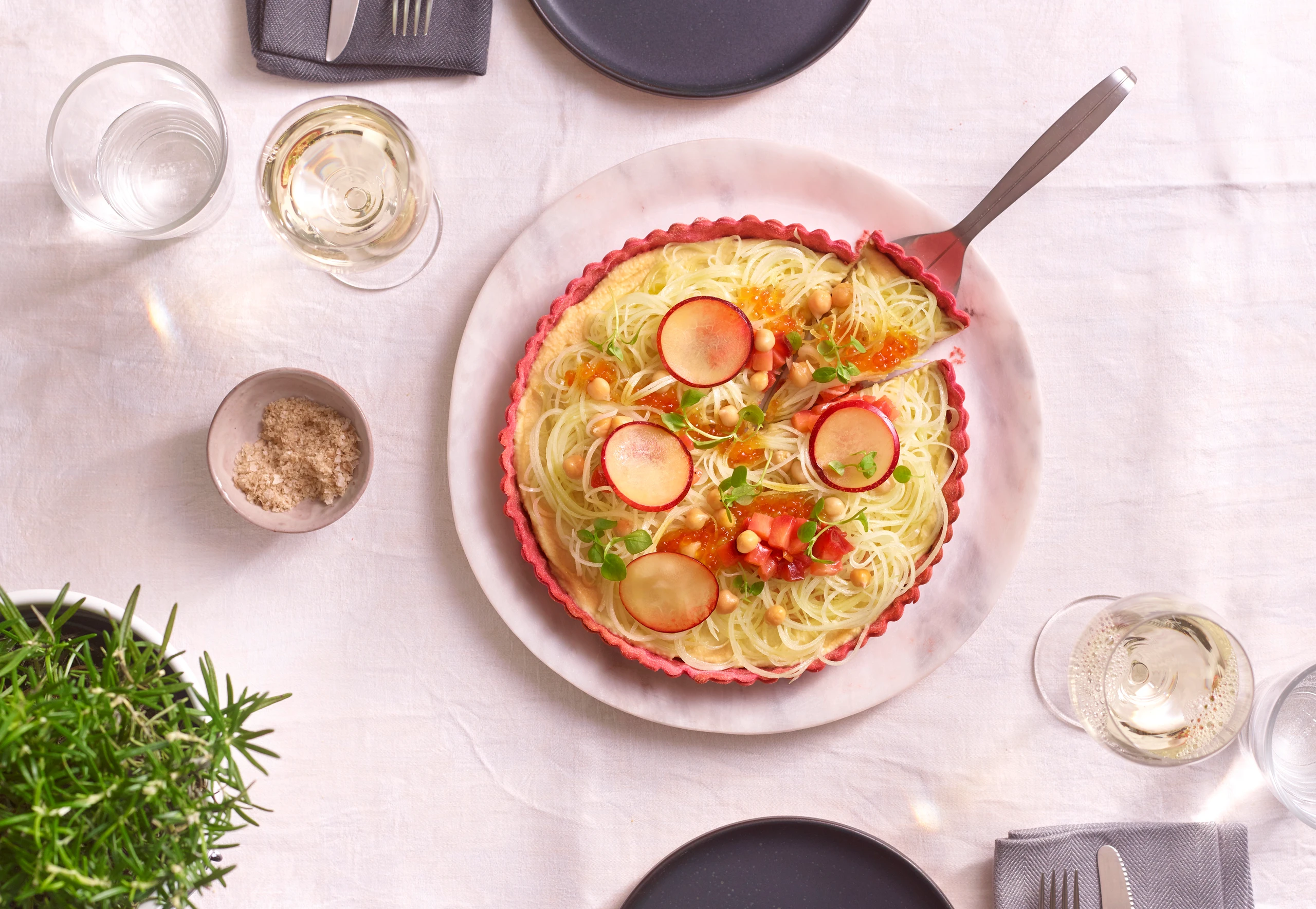 - Für die Fülle Kohlrabi schälen und mit dem Spiralschneider in dünne Schnüre schneiden. Hummus auf dem Teig verstreichen und mit Kohlrabi belegen.