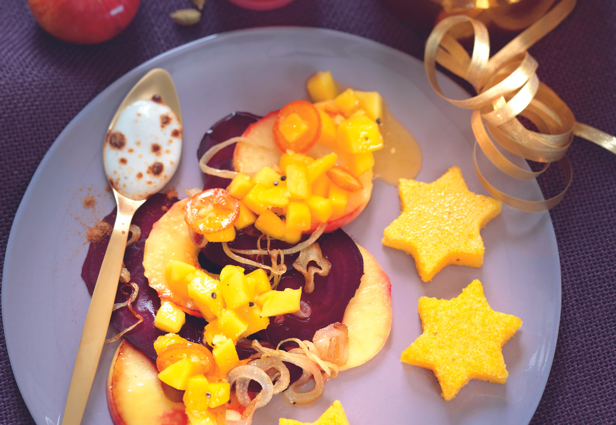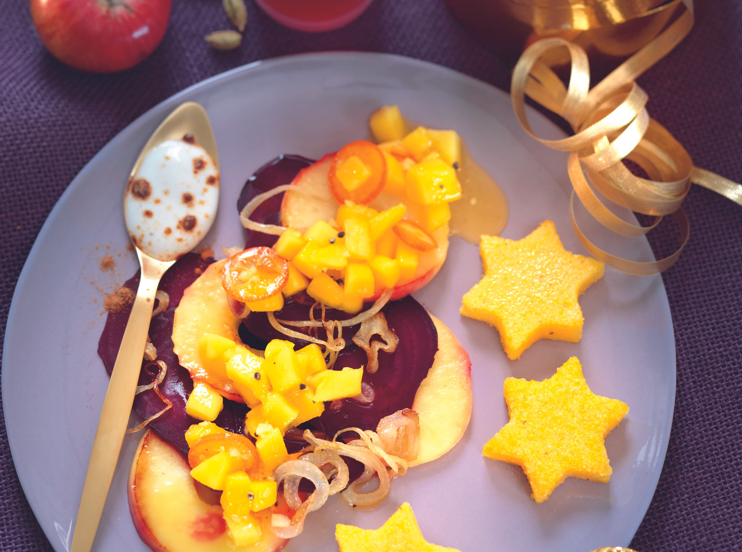 In einer zweiten Pfanne 1 EL Öl erhitzen, Äpfel darin auf beiden Seiten anbraten. Rote Rüben und Äpfel mit Mango-Salsa, Rahm-Dip und Polenta-Sternen anrichten.