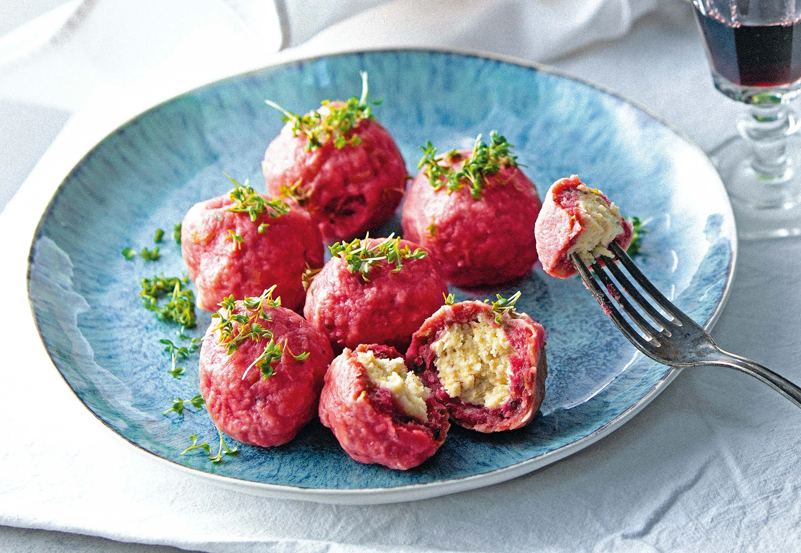 Rübenmasse in 8 Portionen teilen, ein wenig flach drücken und mit der Fülle belegen. Masse über der Fülle schließen und zu glatten Bällchen drehen. Salzwasser aufkochen, Bällchen einlegen und ca. 12 Minuten köcheln. Für die Garnitur Kresse abschneiden.