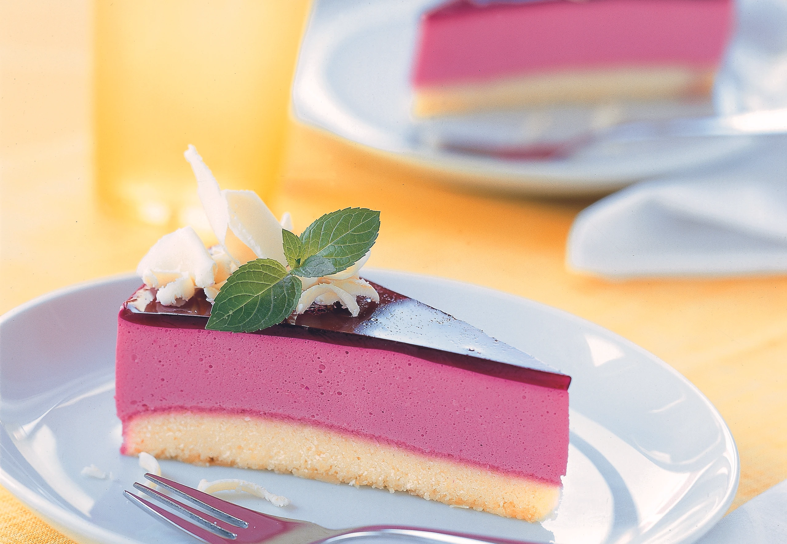 - Für das Gelee Gelatine in kaltem Wasser einweichen, ausdrücken und mit ca. 3 EL vom Roten Rübensaft erhitzen, bis sich die Gelatine aufgelöst hat. Mit dem restlichen Rübensaft vermischen und auf die Creme gießen. Torte ca. 1 Stunde kühlen, bis das Gelee gestockt ist.