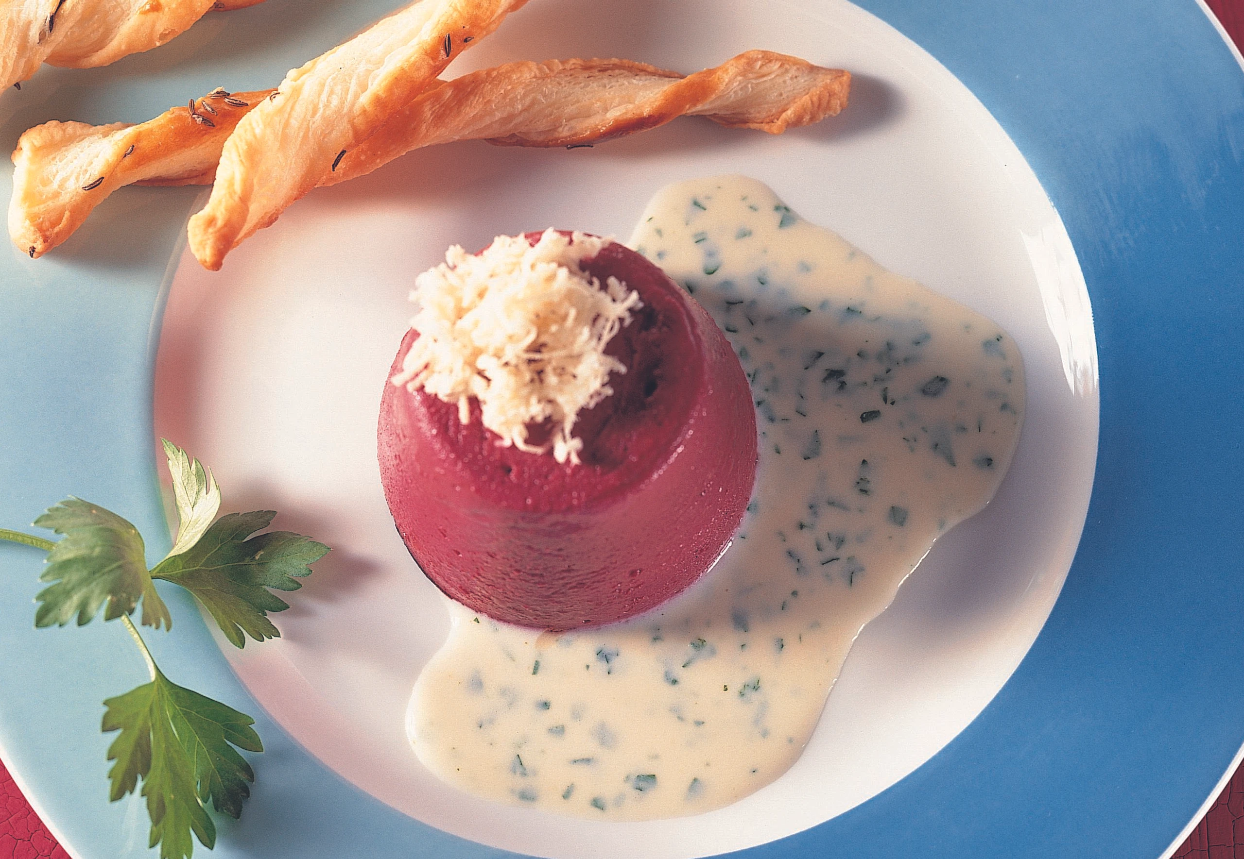 Rote-Rüben-Flans im vorgeheizten Rohr (unterste Schiene) ca. 40 Minuten garen. Flans aus dem Rohr nehmen, auf Teller stürzen und mit den – inzwischen zubereiteten – Beilagen, der Kräuter-Krensauce und den Kümmelstangerln anrichten.