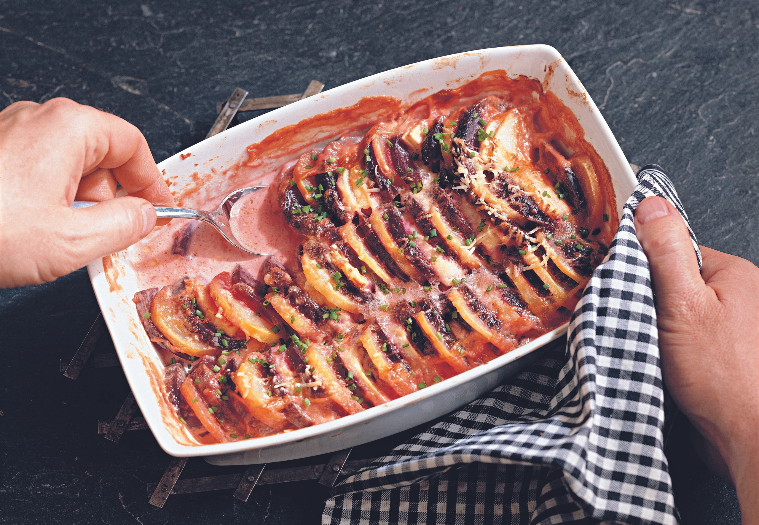 Erdäpfel, Äpfel und Rote Rüben schälen, in ca. 1/2 cm dicke Scheiben schneiden und abwechselnd in die Form schichten.