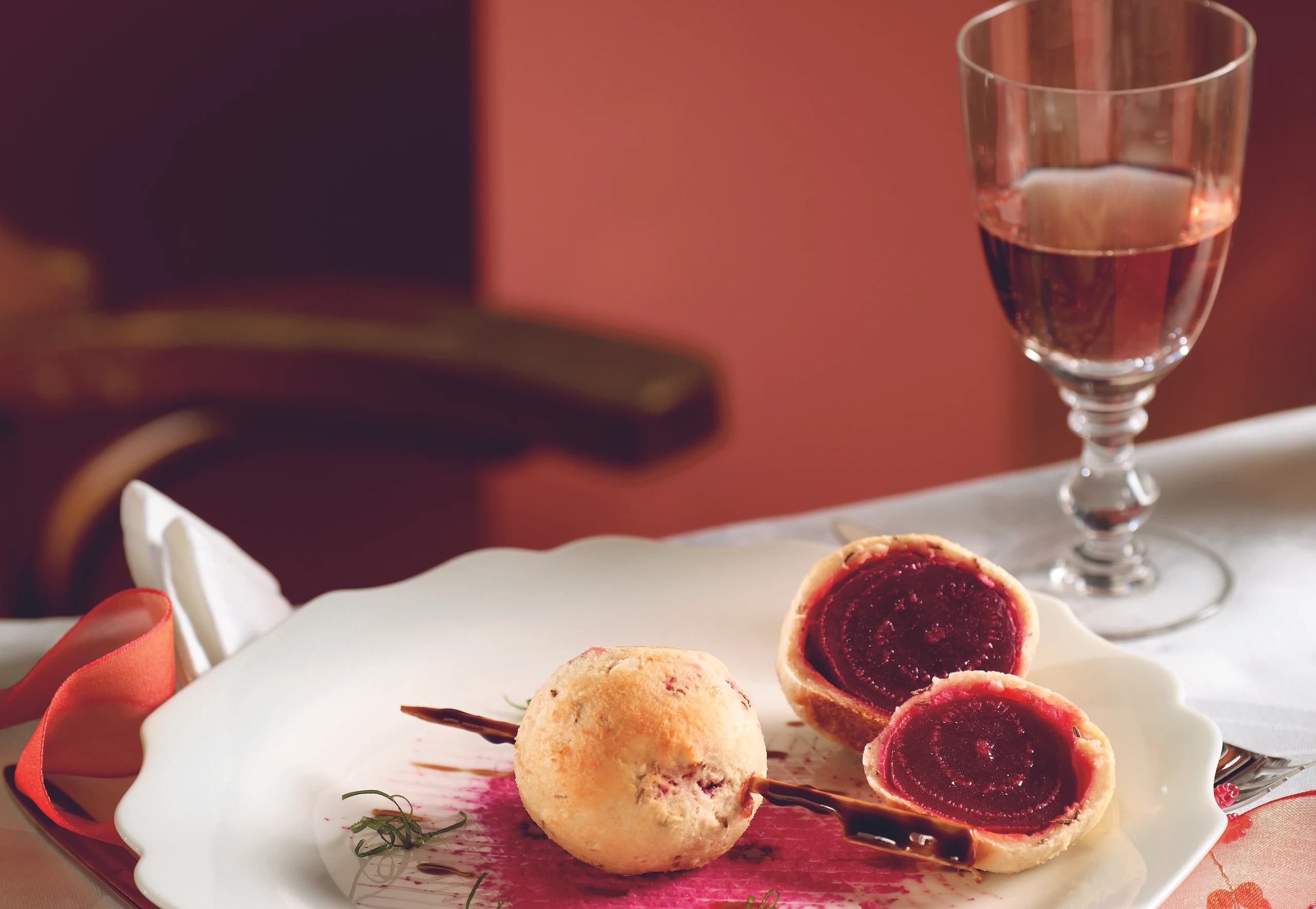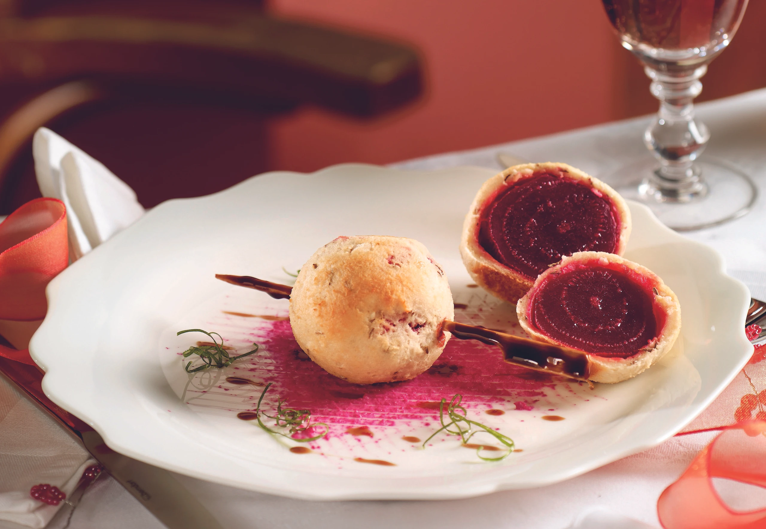Rote Rüben in der Kümmel-Krenkruste auf Balsamico-Spieß