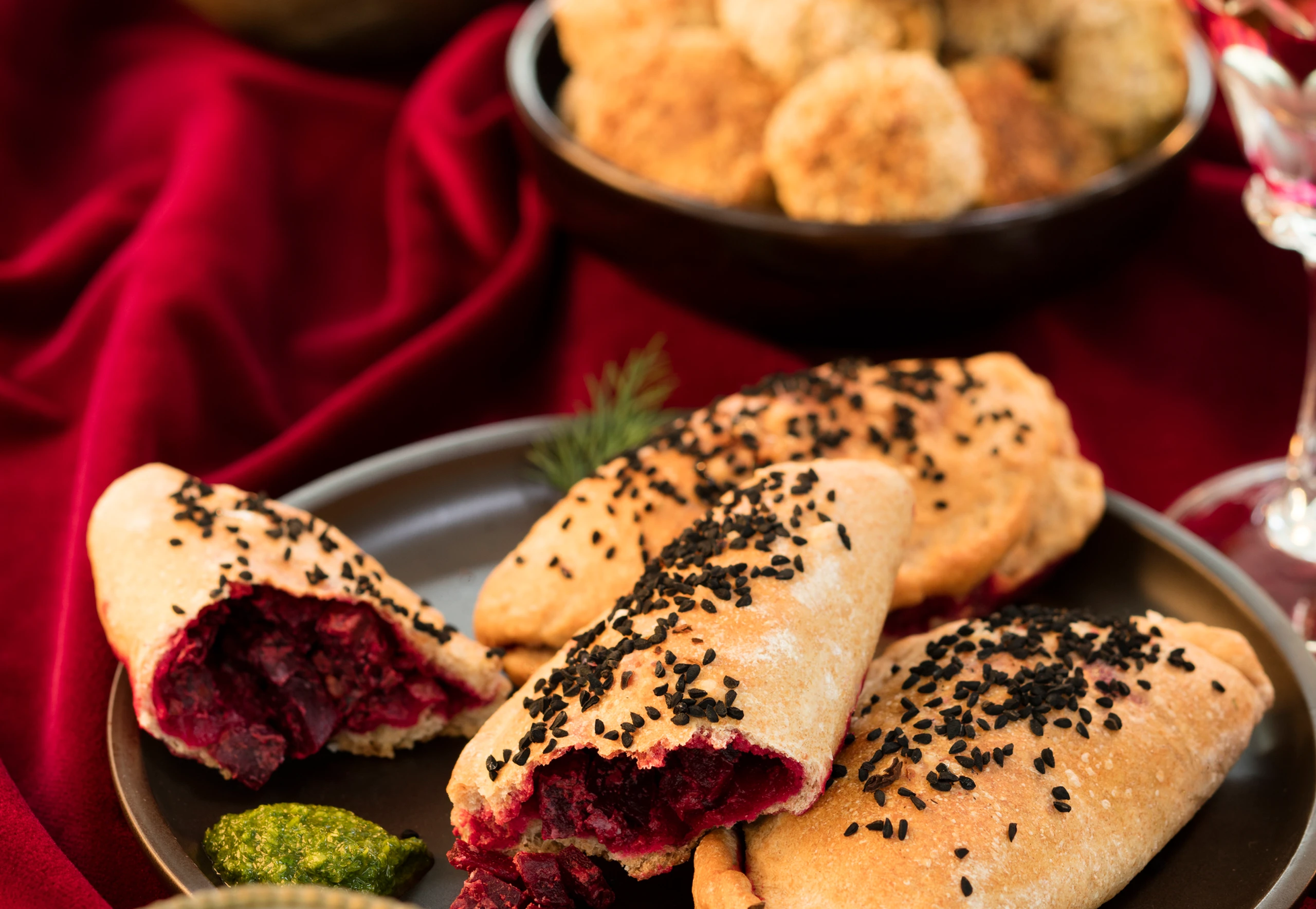 Rote-Rüben-Kokos-Taschen mit Dill-Koriander-Pesto