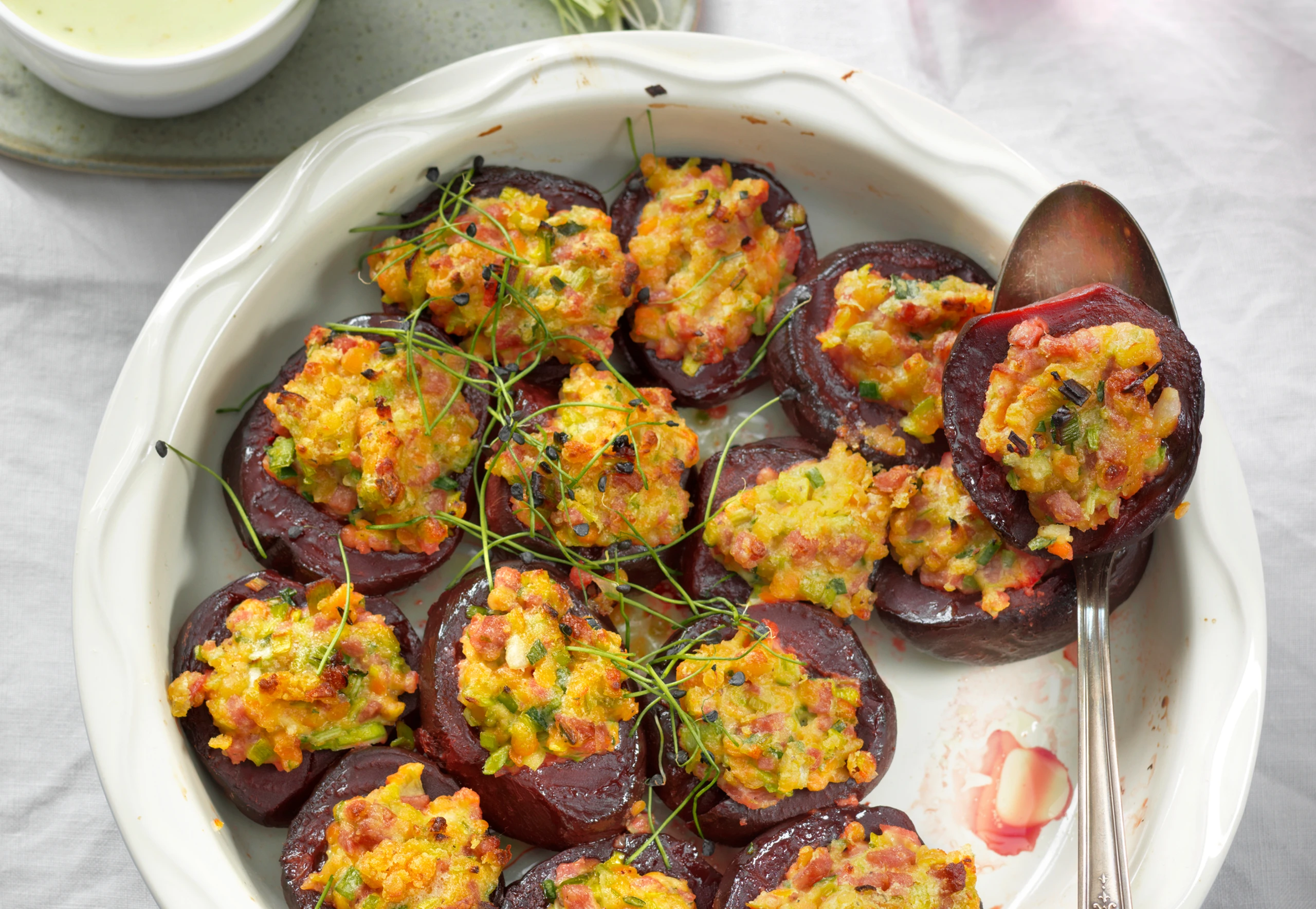 Rüben quer halbieren und eventuell die Hälften am Boden ein wenig abflachen, damit sie gerade stehen. Fülle auf den Rübenhälften verteilen. Rüben in die Auflaufform setzen und im Rohr (mittlere Schiene / Gitterrost) ca. 16 Minuten backen.
