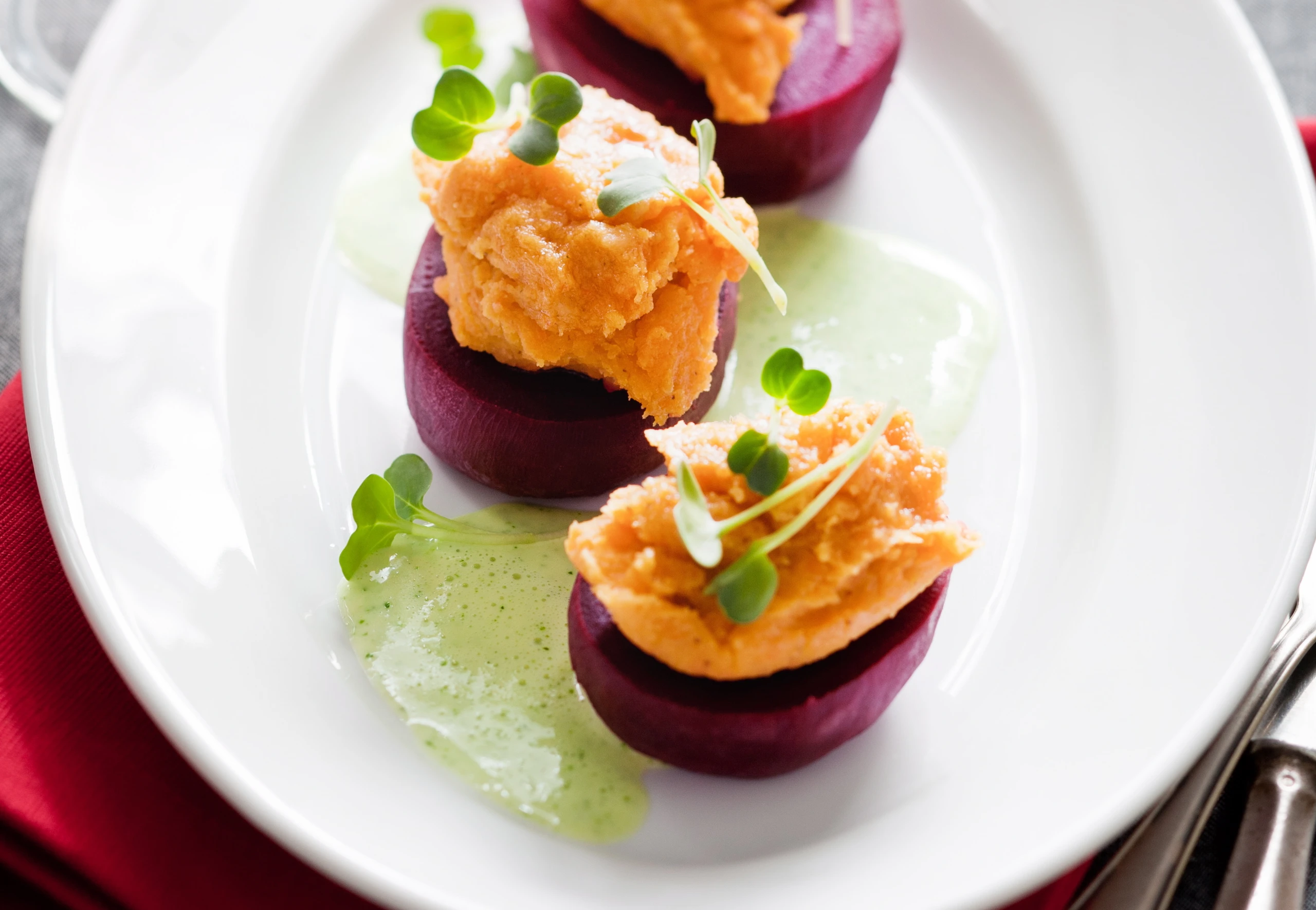 Rohr auf 180°C vorheizen. Auflaufform mit Butter ausstreichen. Rüben schälen, quer halbieren. Die Hälften am Boden ein wenig abflachen, damit sie gerade stehen. Linsenpüree auf den Rübenhälften verteilen. Rüben in die Auflaufform setzen, mit wenig Suppe untergießen und im Rohr (mittlere Schiene / Gitterrost) ca. 20 Minuten backen.