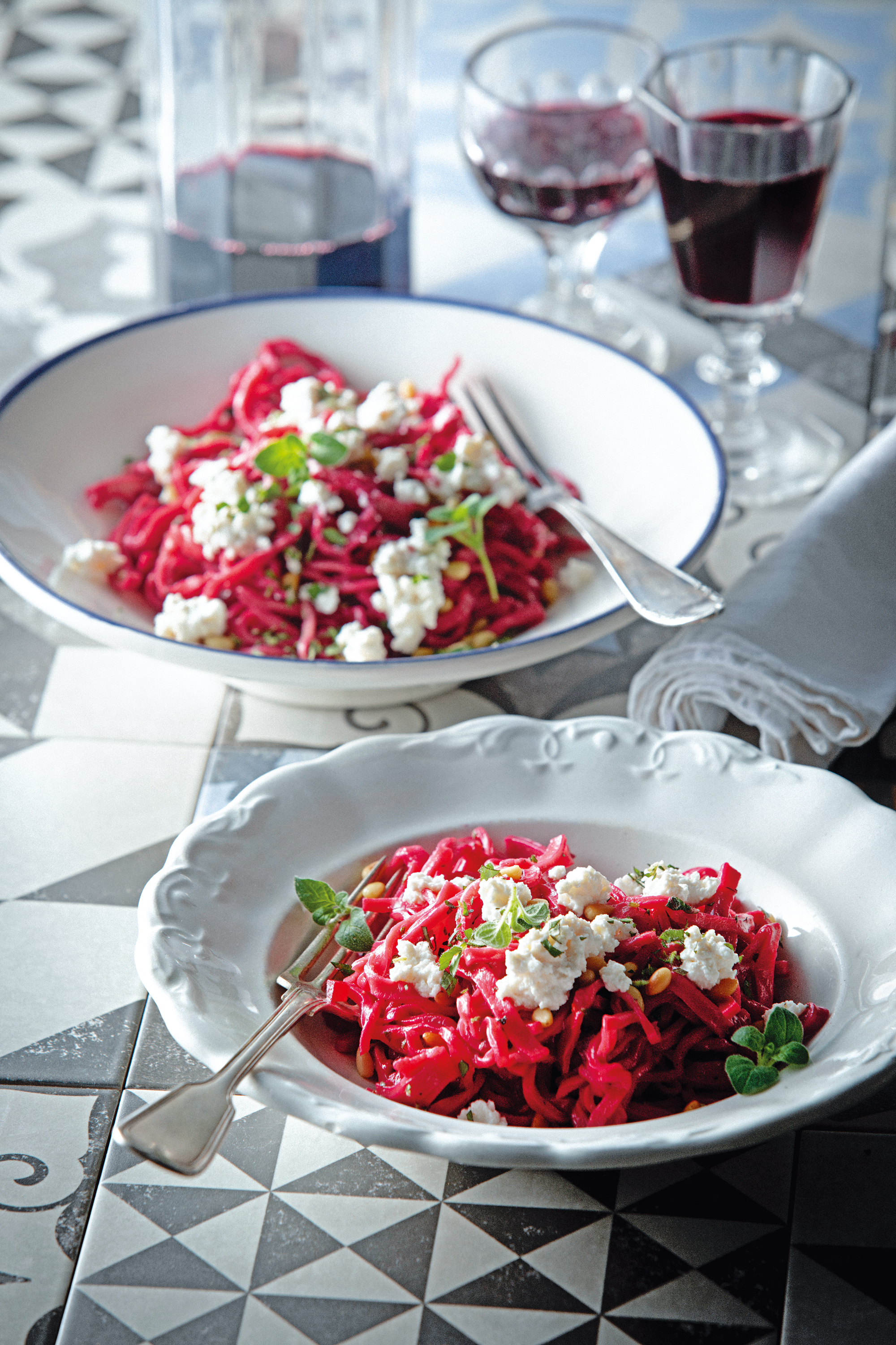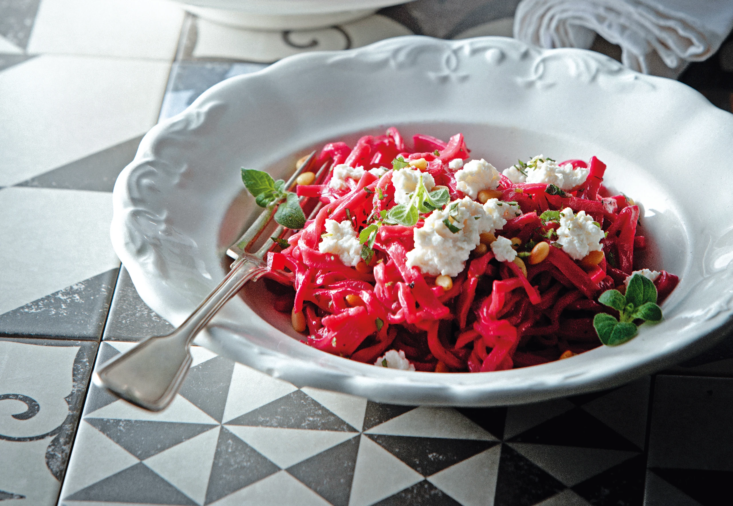 Rote-Rüben-Pasta mit Pignoli und Ricotta
