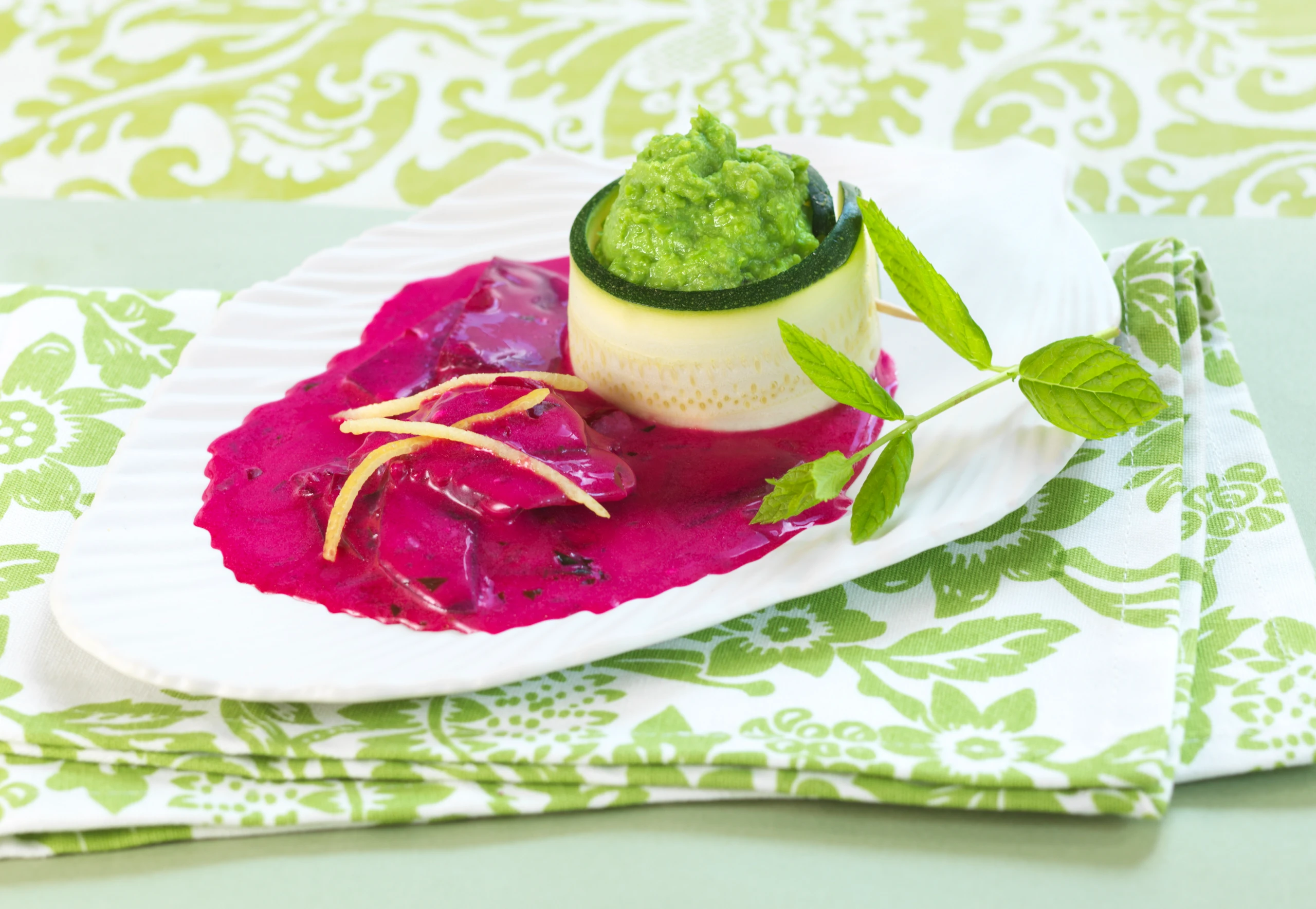 Erbsenpüree portionsweise anrichten. Jeweils eine Zucchinischeibe mit einem Zahnstocher ringförmig fixieren. Zucchini-Ring auf einen Teller setzen, mit dem Erbsenpüree füllen. Ragout dazu anrichten, mit Zitronenschale und evtl. Minze garnieren.
