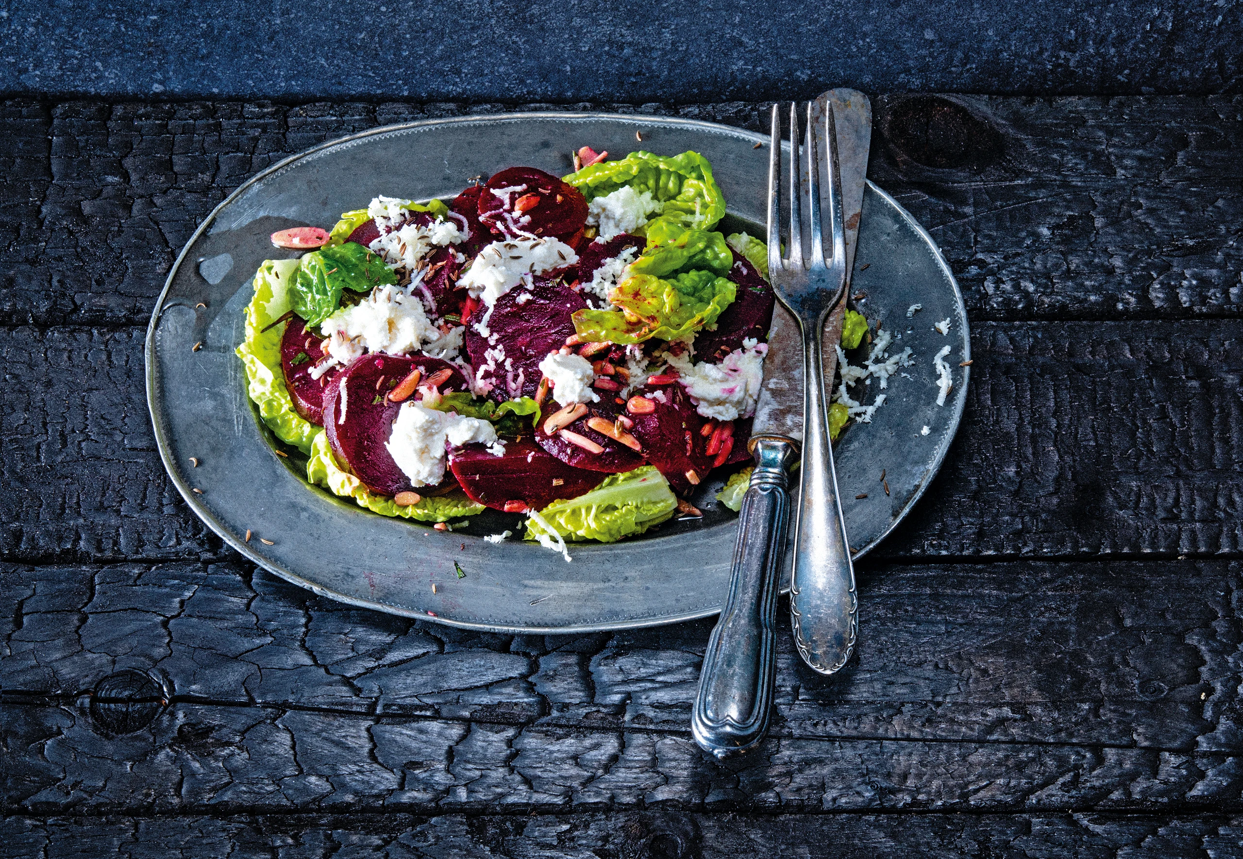 Rote Rüben mit Salatherzen, Kren und Ricotta