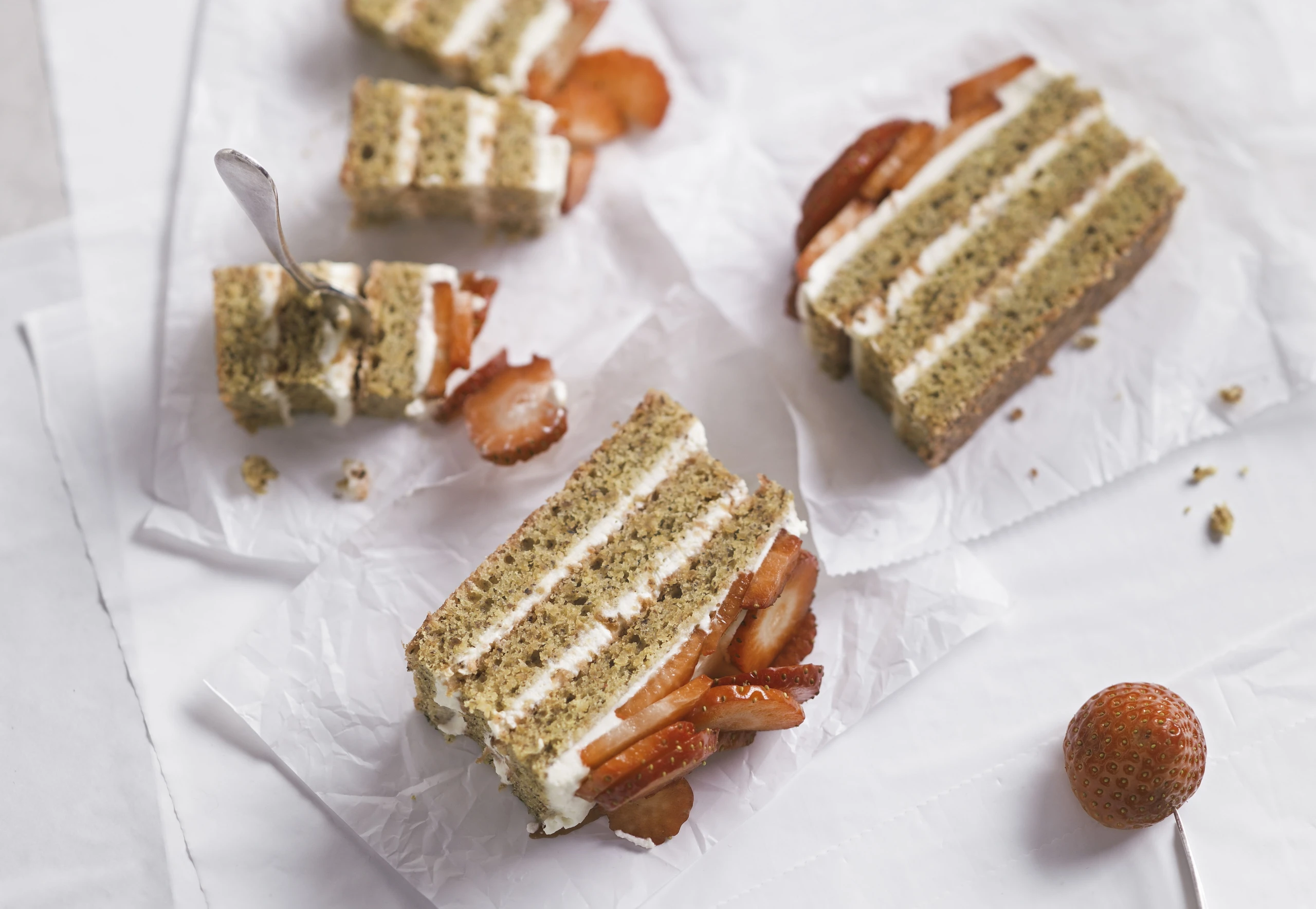- Für die Creme Mascarpone, Staubzucker, Zitronenschale und Schlagobers dickcremig rühren. Streifen gleichmäßig mit der Creme bestreichen, übereinander setzen und behutsam andrücken. Erdbeeren putzen und in Scheiben schneiden. Schnitte mit Erdbeerscheiben garnieren und portionieren.