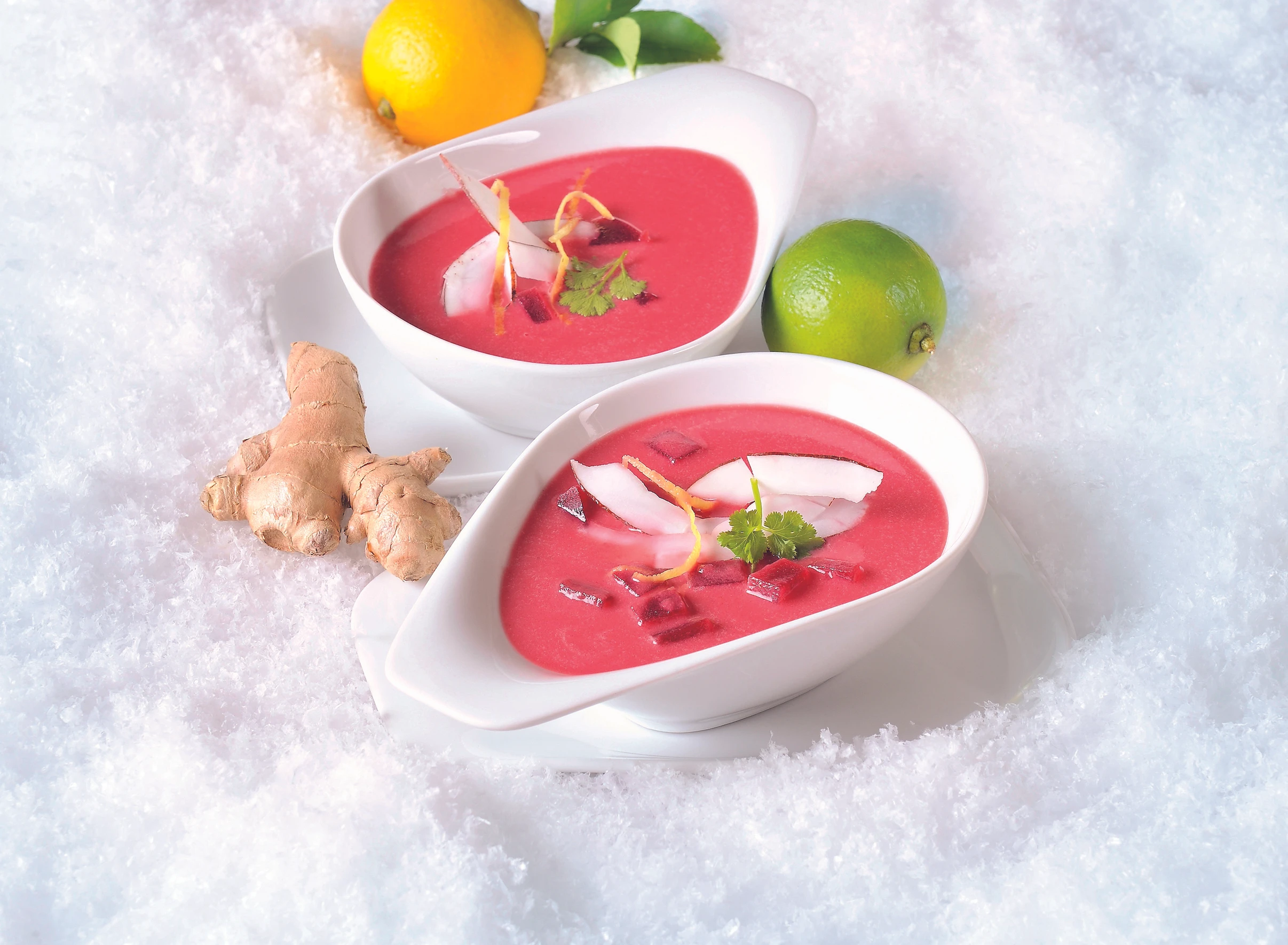 - Suppe mit Limettensaft, Salz und Pfeffer abschmecken, mit Rübenwürfeln, Kokos-Spänen, Zitronenzesten und Koriander garnieren.