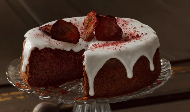- Für die Glasur Staubzucker mit Zitronensaft verrühren. Springform öffnen und abheben. Torte mit der Glasur verzieren, Glasur fest werden lassen. Torte eventuell mit Rübenchips garnieren.
