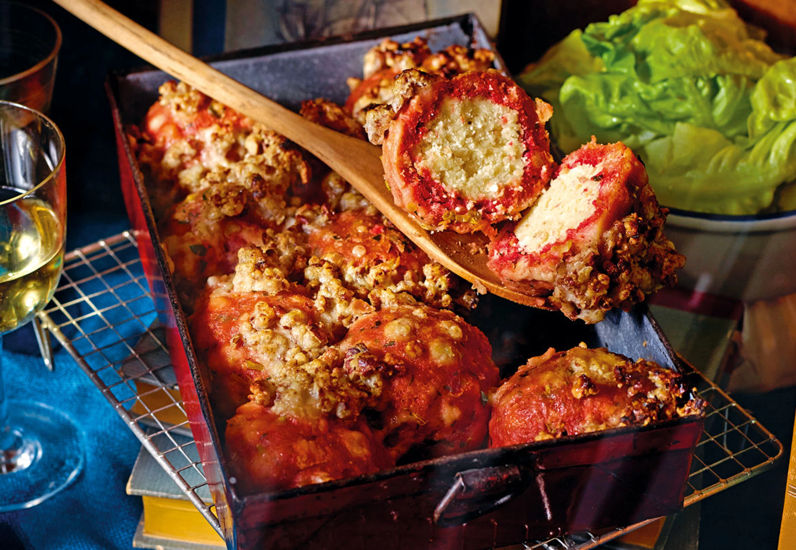 Für die Fülle Feta trockentupfen, mit einer Gabel zerdrücken und mit den Bröseln vermischen. Masse salzen, pfeffern und zu 12 Knödeln formen.