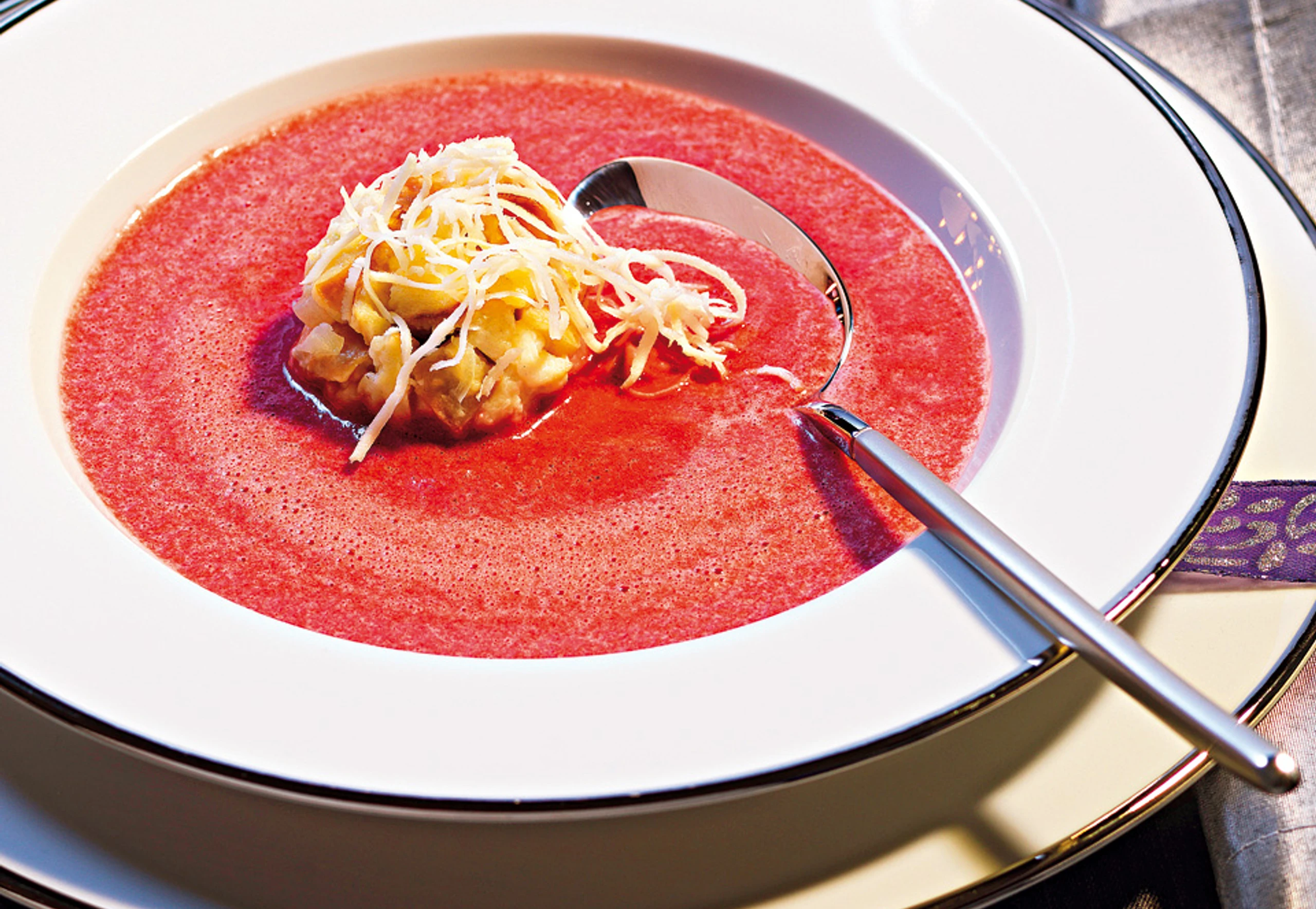 - Für die Suppe Zwiebel und Erdäpfel schälen und in 0,5 cm große Stücke schneiden. Rote Rüben in ca. 1 cm große Stücke schneiden. Zwiebel, Rote Rüben und Erdäpfel in 1 EL Butter anschwitzen und mit Suppe aufgießen. Suppe ca. 15 Minuten köcheln.
