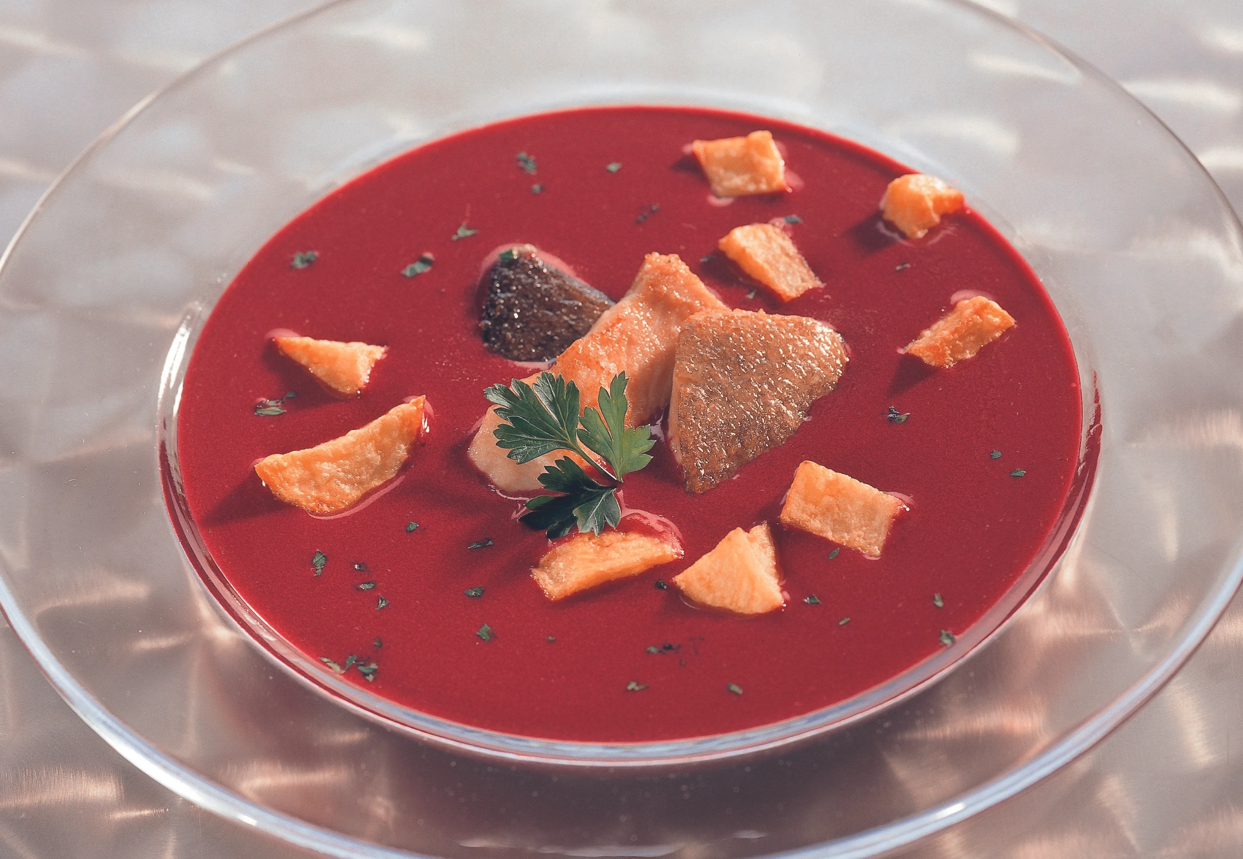 Rote Rübensuppe mit Forellenfilets