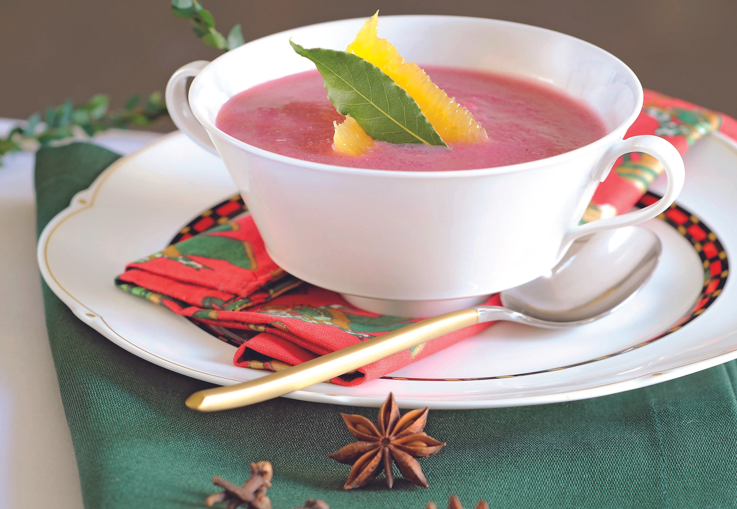 Rotkraut-Apfel-Suppe mit Preiselbeeren und Orangenfilets