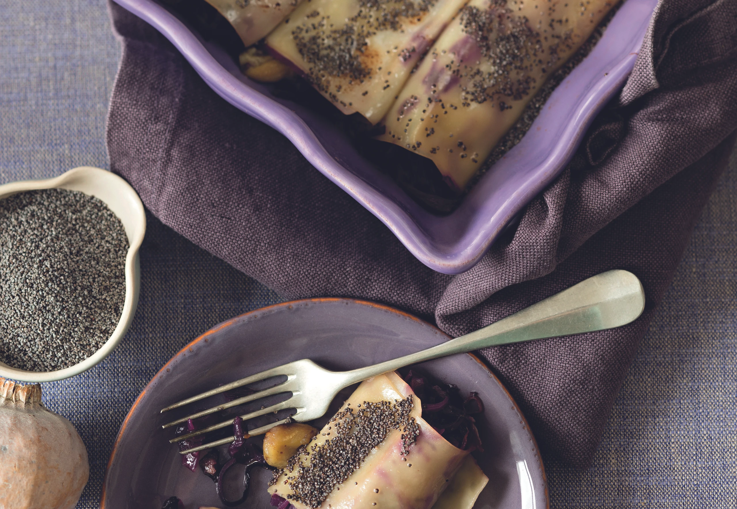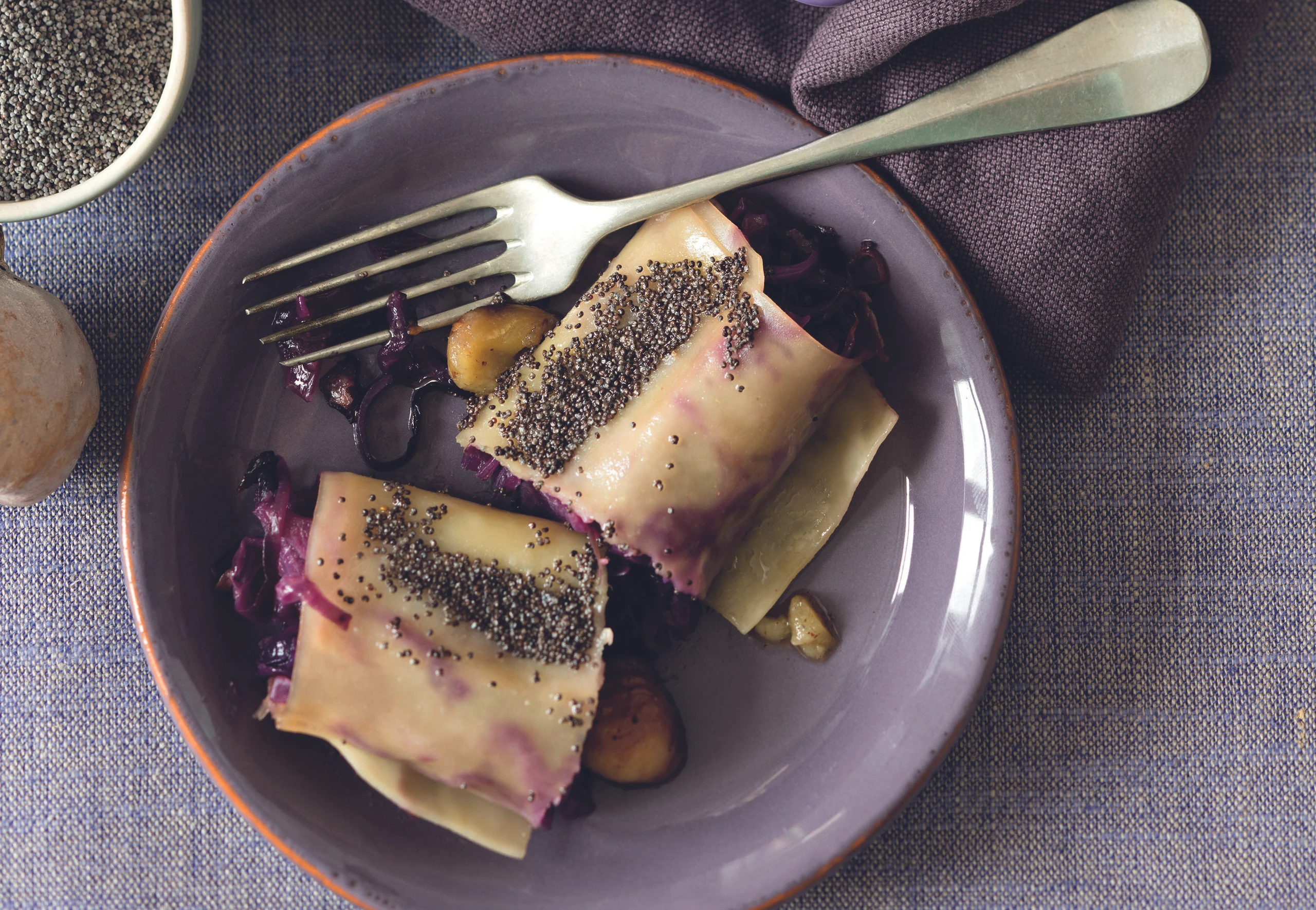 Rotkraut-Cannelloni mit Mohnbutter