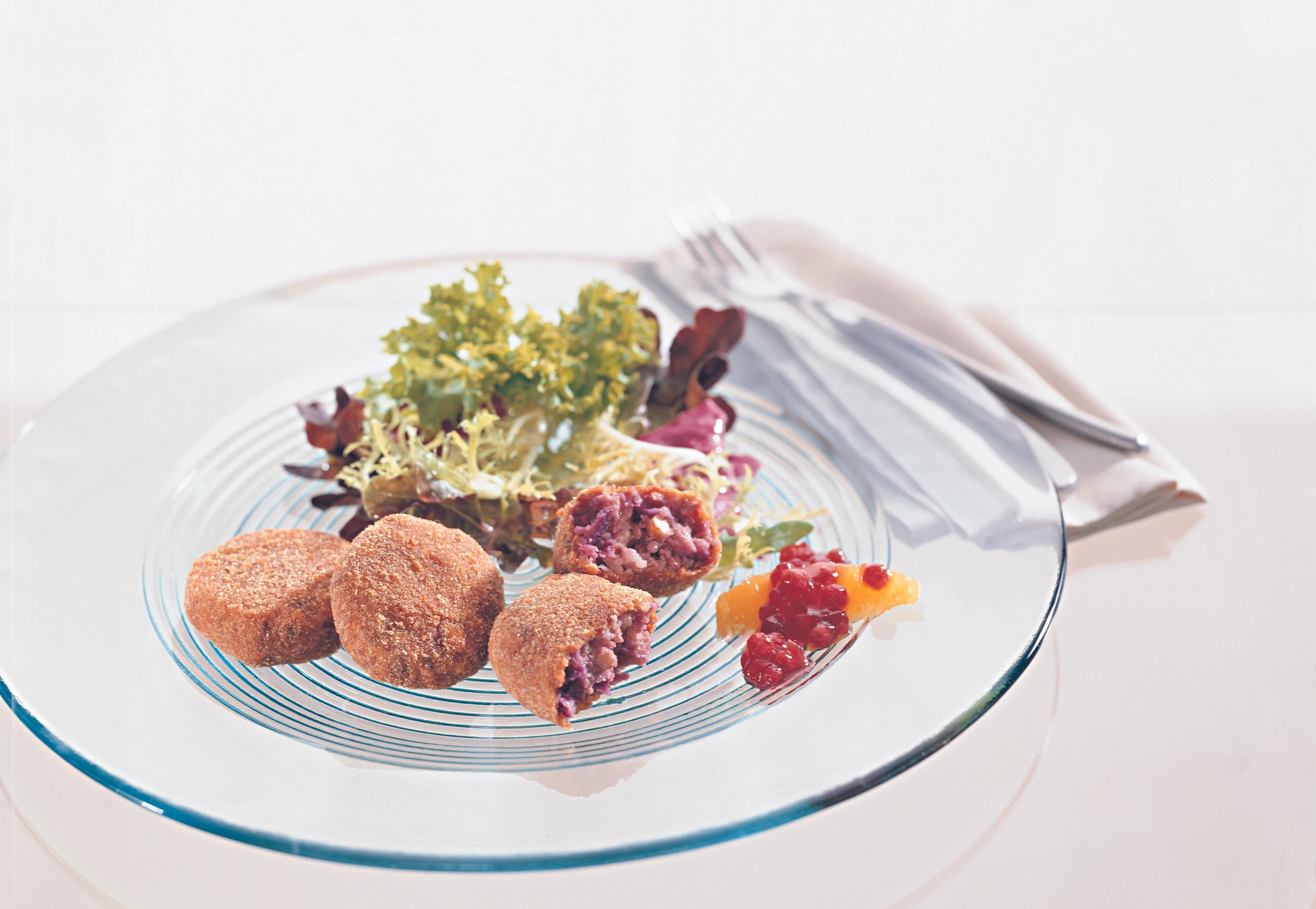 Laibchen in Mehl, Eiern und Bröseln panieren. In einer Pfanne Öl erhitzen, Laibchen darin backen und auf Küchenpapier abtropfen lassen. Laibchen mit den Preiselbeer-Orangen anrichten. Dazu passt Blattsalat.