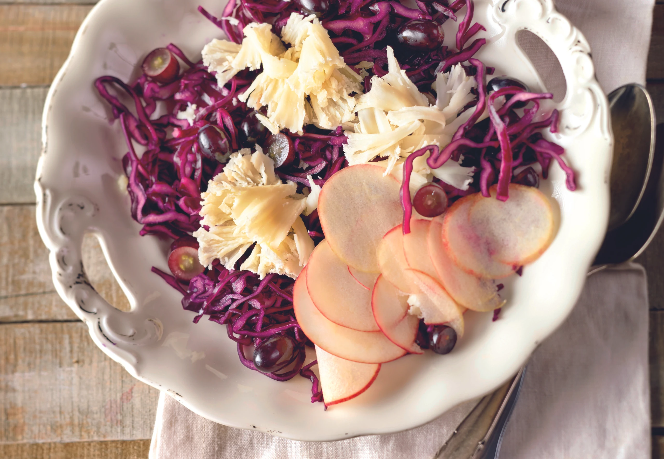 Trauben halbieren und mit dem Kraut vermischen. Kraut anrichten, Käse in feinen Röschen oder Spänen abhobeln und auf dem Kraut verteilen. Äpfel in dünne Scheiben hobeln und auf dem Salat anrichten.