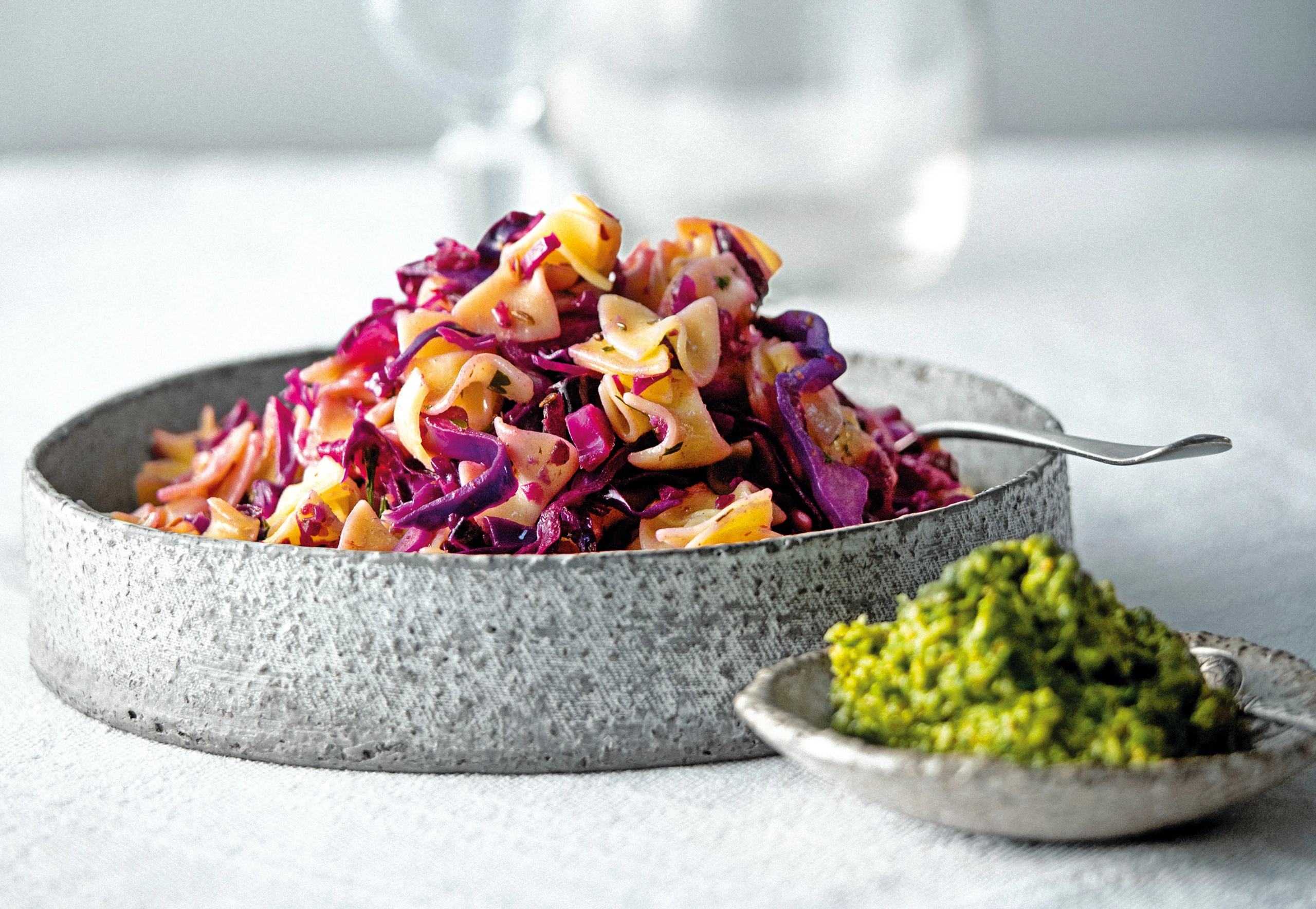 Rotkrautfleckerl mit Petersil-Birnenpesto