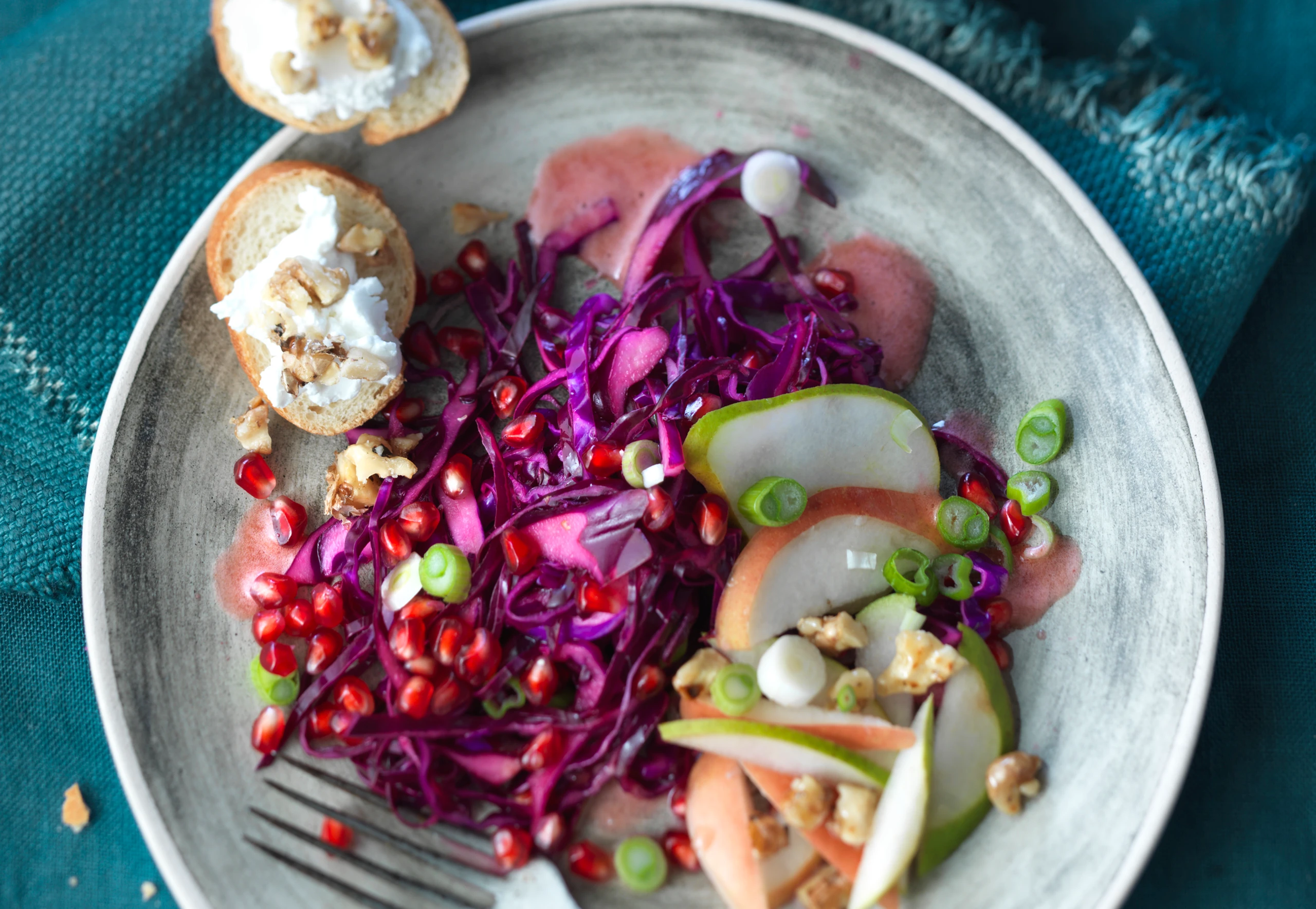 Rotkraut, Granatpfelkerne und Jungzwiebeln mit dem Dressing vermischen. Salat portionsweise mit Birnen und Crostinis anrichten.