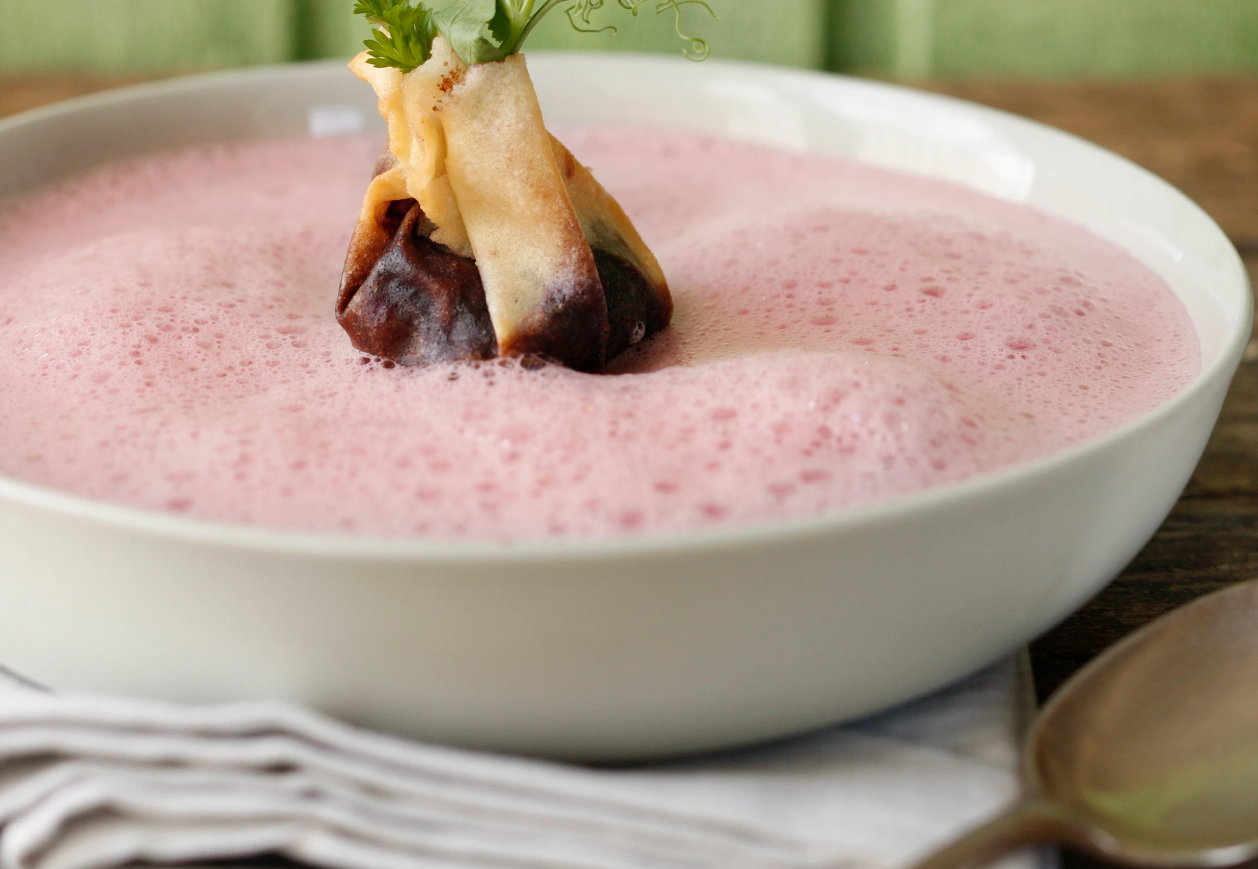Suppe aufkochen, salzen, pfeffern, mit Arganöl und Apfelbalsamessig verfeinern. Suppe mixen und mit den Rotkrautsackerln servieren.
