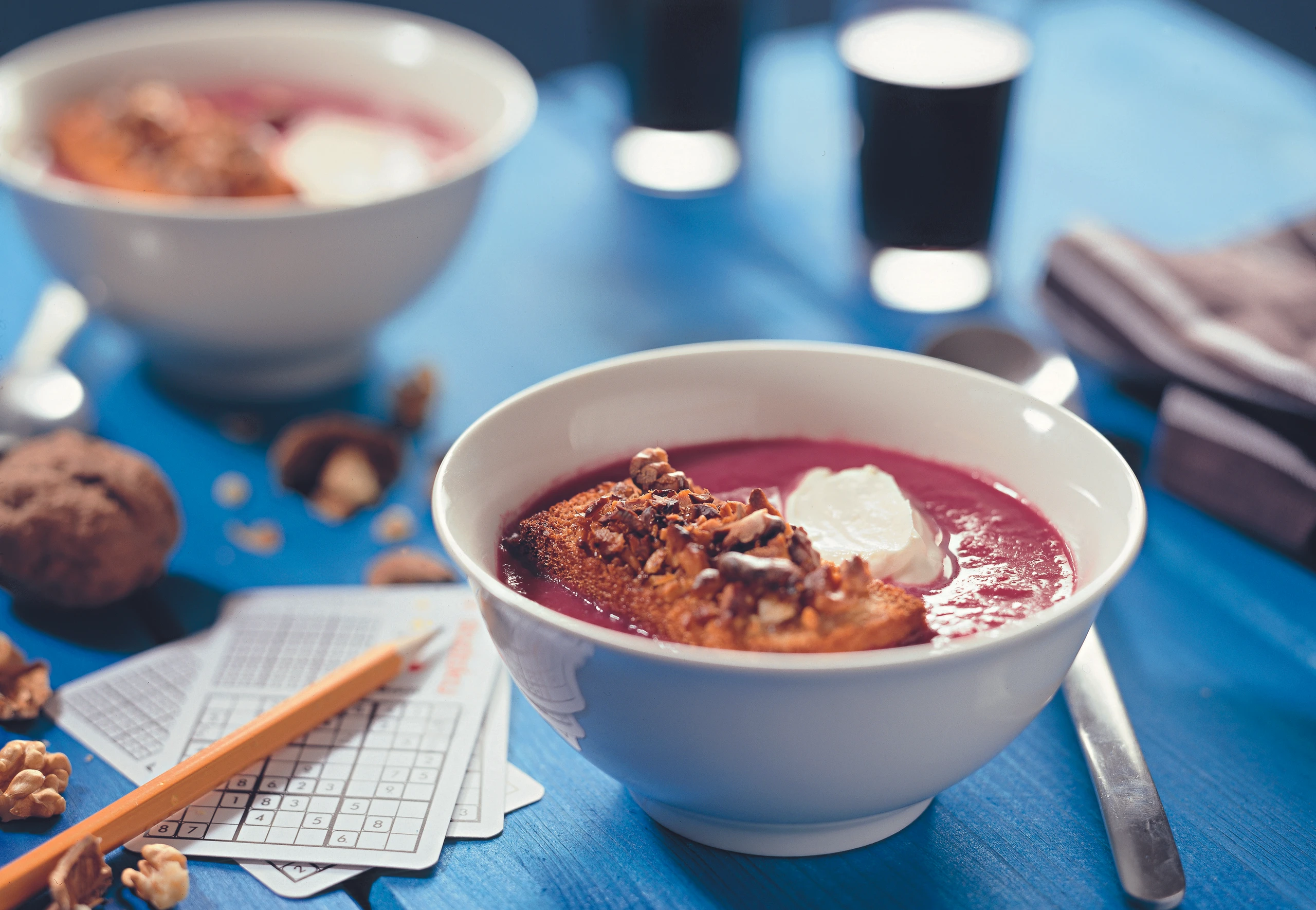 Gewürze entfernen, Suppe mit Preiselbeerkompott verfeinern und fein pürieren. 5+6 Toastscheiben halbieren, mit Butter bestreichen, mit Nüssen belegen und mit Zucker bestreuen. Im 200°C heißen Rohr ca. 2 Minuten bräunen. Suppe mit den Toasts und einem Löffel Crème fraîche servieren.