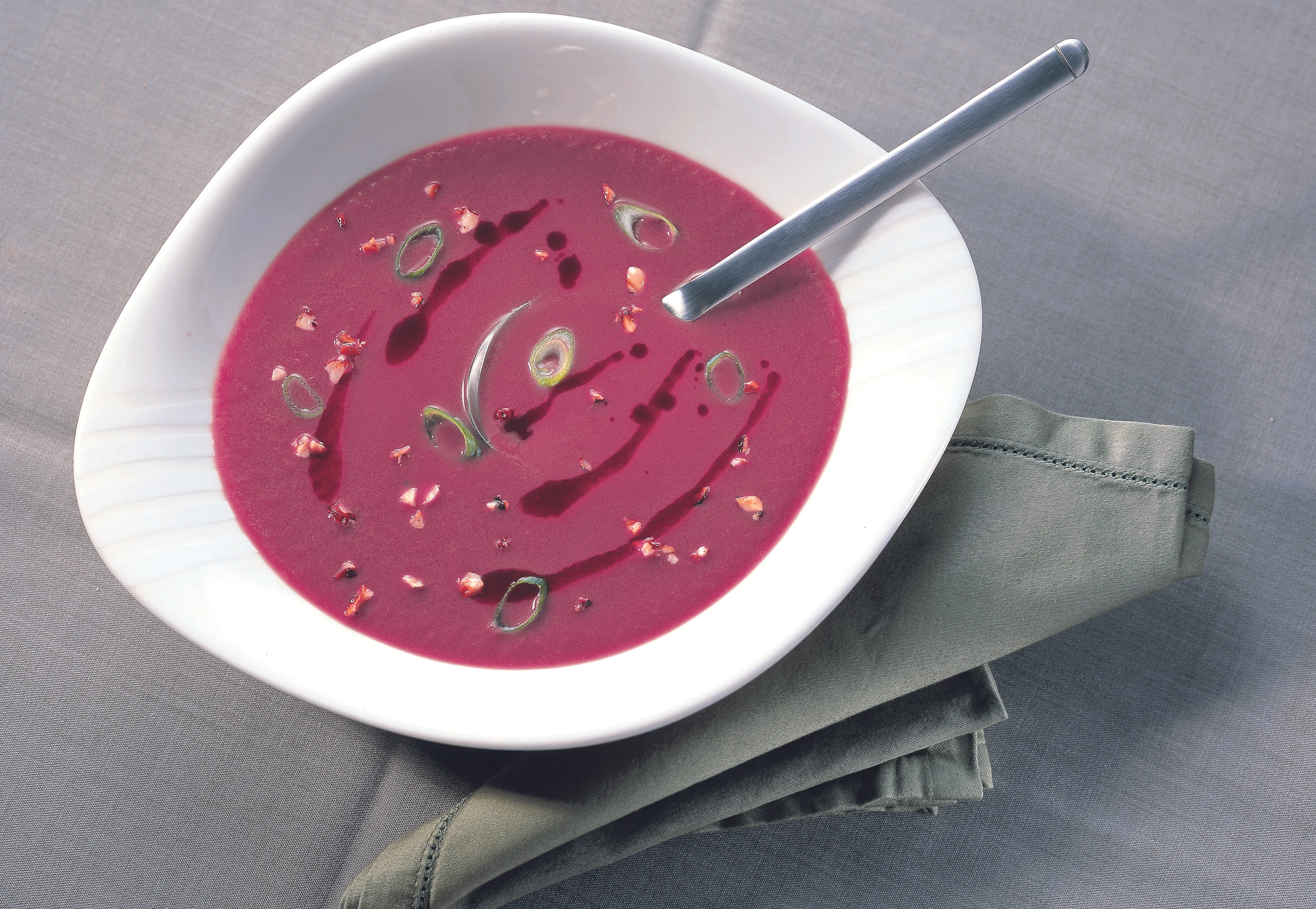 Suppe mit einem Stabmixer fein pürieren (falls nötig, mit klarer Suppe verdünnen), mit einigen Tropfen Zitronensaft abschmecken und aufkochen. Suppe in vorgewärmte Teller schöpfen, mit Portweinsauce beträufeln, mit Nüssen und Jungzwiebelringen bestreut servieren.