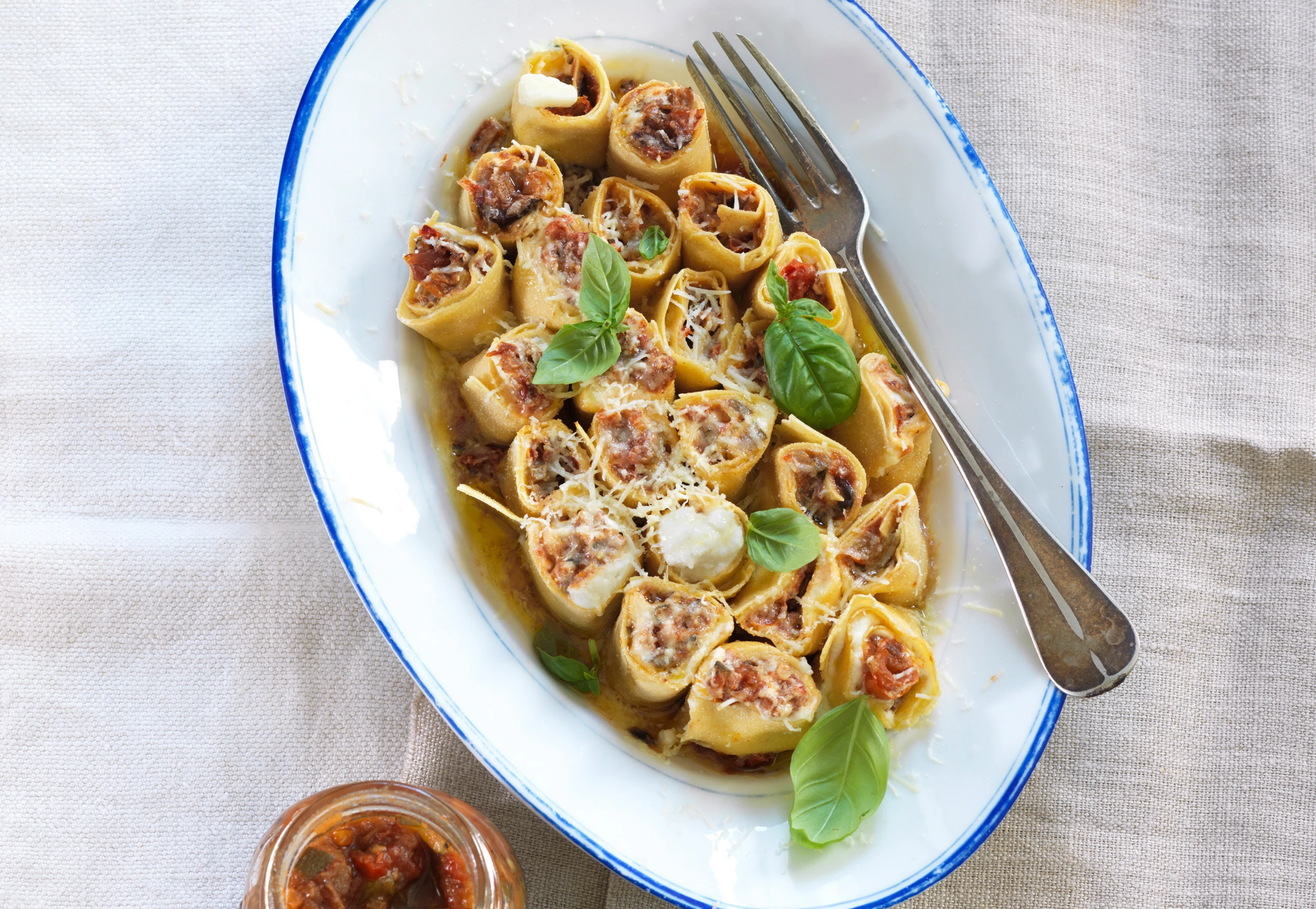 - Rohr auf 180°C vorheizen. Teig auf einer bemehlten Arbeitsfläche ausrollen, in Rechtecke (12 x 20 cm) schneiden. Teigstreifen zuerst mit Ricotta, dann mit je 1 EL Gemüsefülle belegen. Streifen einrollen, halbieren und in die vorbereitete Form setzen.