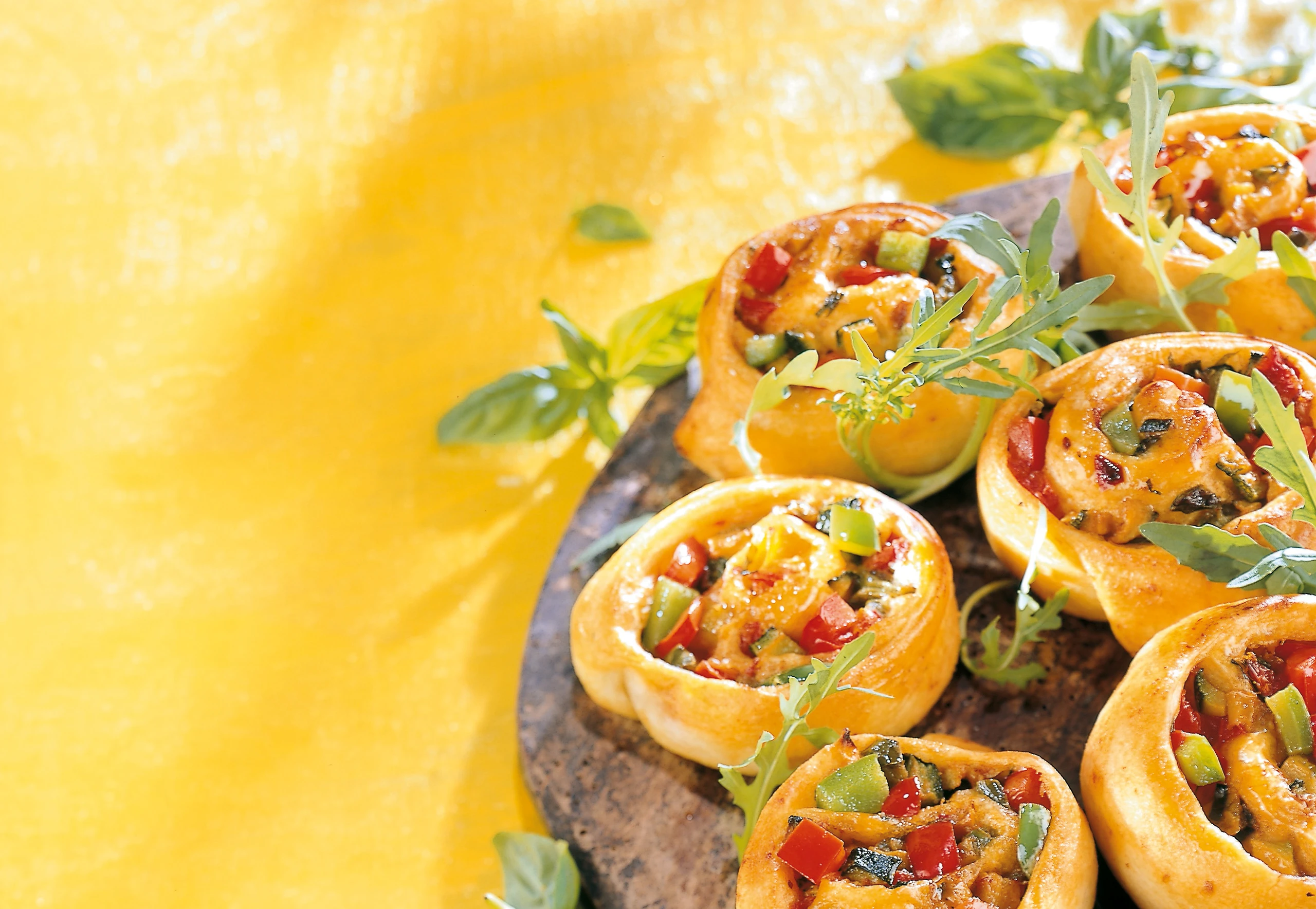 Während der Teig rastet, Fülle zubereiten: Paprika, Zucchini, Jungzwiebel und Knoblauch putzen, wo nötig schälen und in kleine Würfel schneiden. Gemüse kurz in Olivenöl anrösten, Paradeismark einrühren und kurz mitrösten. Ansatz mit Rotwein ablöschen, kurz durchkochen, kräftig würzen und auskühlen lassen.