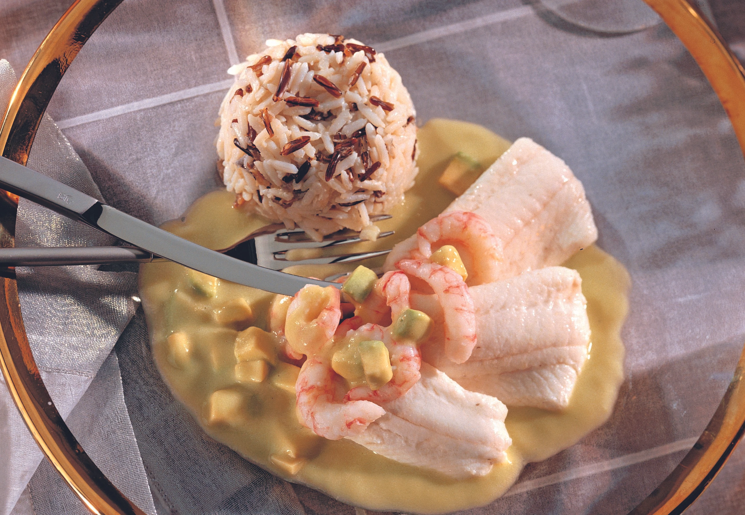 Die Hälfte der Avocadowürfel in den Fond geben und mit einem Stabmixer pürieren. Restliche Avocadowürfel in die Sauce rühren. Sauce mit Salz und wenig Cayennepfeffer würzen. Fischfilets und Shrimps mit der Avocadosauce anrichten. Reis als Beilage reichen.