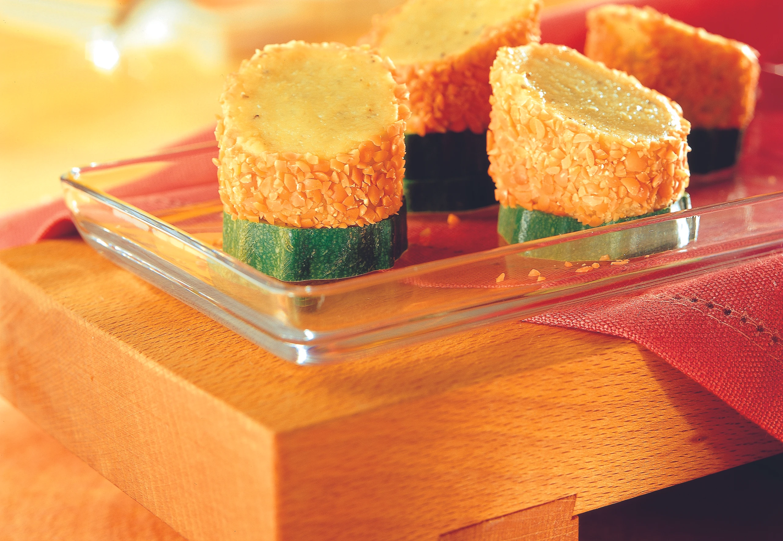 Aus der Zucchini 8 je 1 cm dicke Scheiben schneiden, kurz überkochen und kalt abschrecken. Zucchini auf einem Tuch auflegen und trockentupfen. Linsen in einem Mörser zerstoßen oder im elektrischen Zerkleinerer mittelfein mahlen.