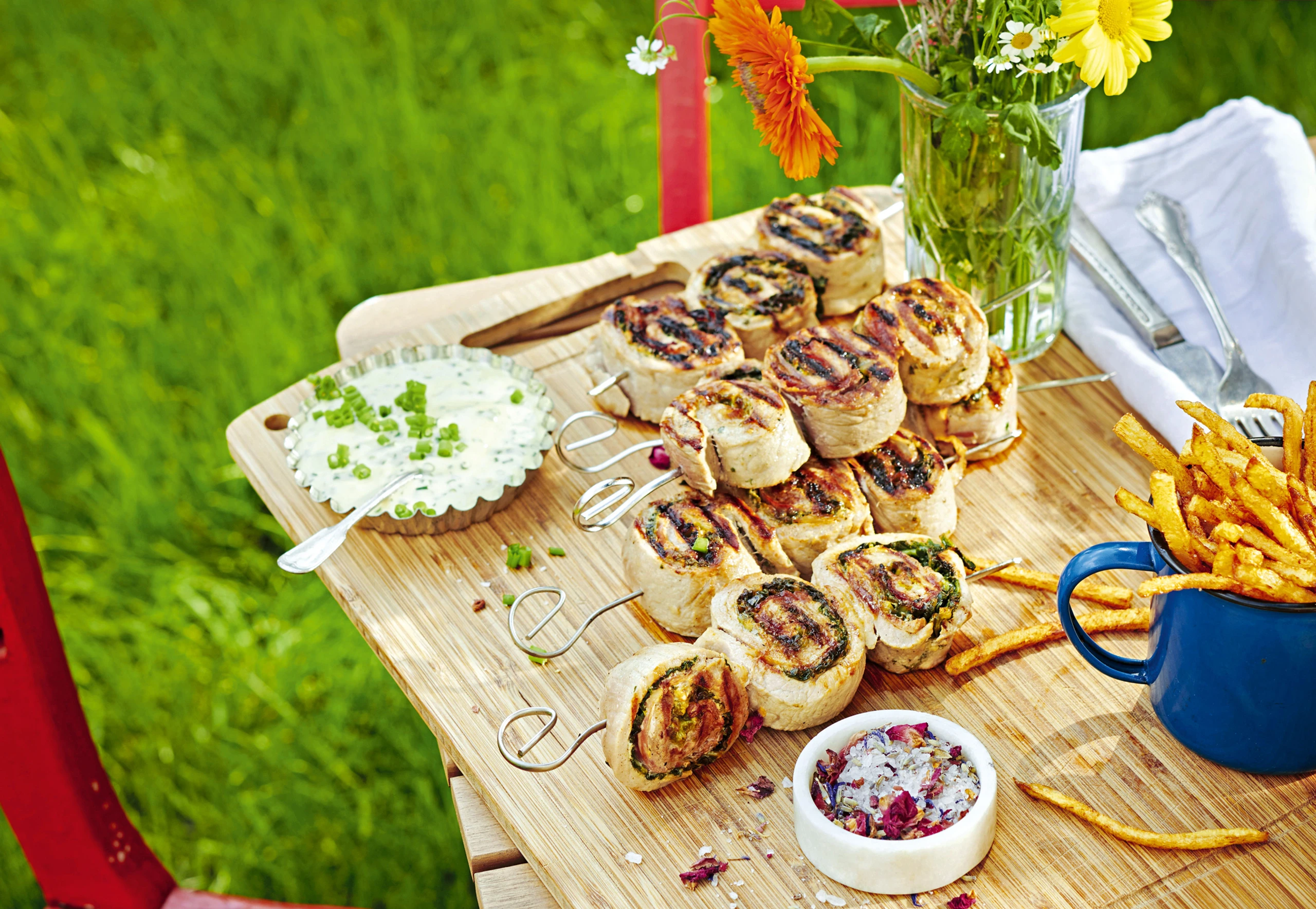 Schnitzel zwischen ein aufgeschnittenes Tiefkühlsäckchen legen, ein wenig klopfen und flach auflegen. Schnitzel salzen, pfeffern, mit der Senfmischung bestreichen und mit je 2 Kohlblättern und 4 Speckscheiben belegen. Schnitzel über die Fülle eng und straff einrollen. Jede Rolle in vier gleichdicke Scheiben schneiden. Je drei Scheiben auf einen Spieß stecken und ein wenig flachdrücken.
