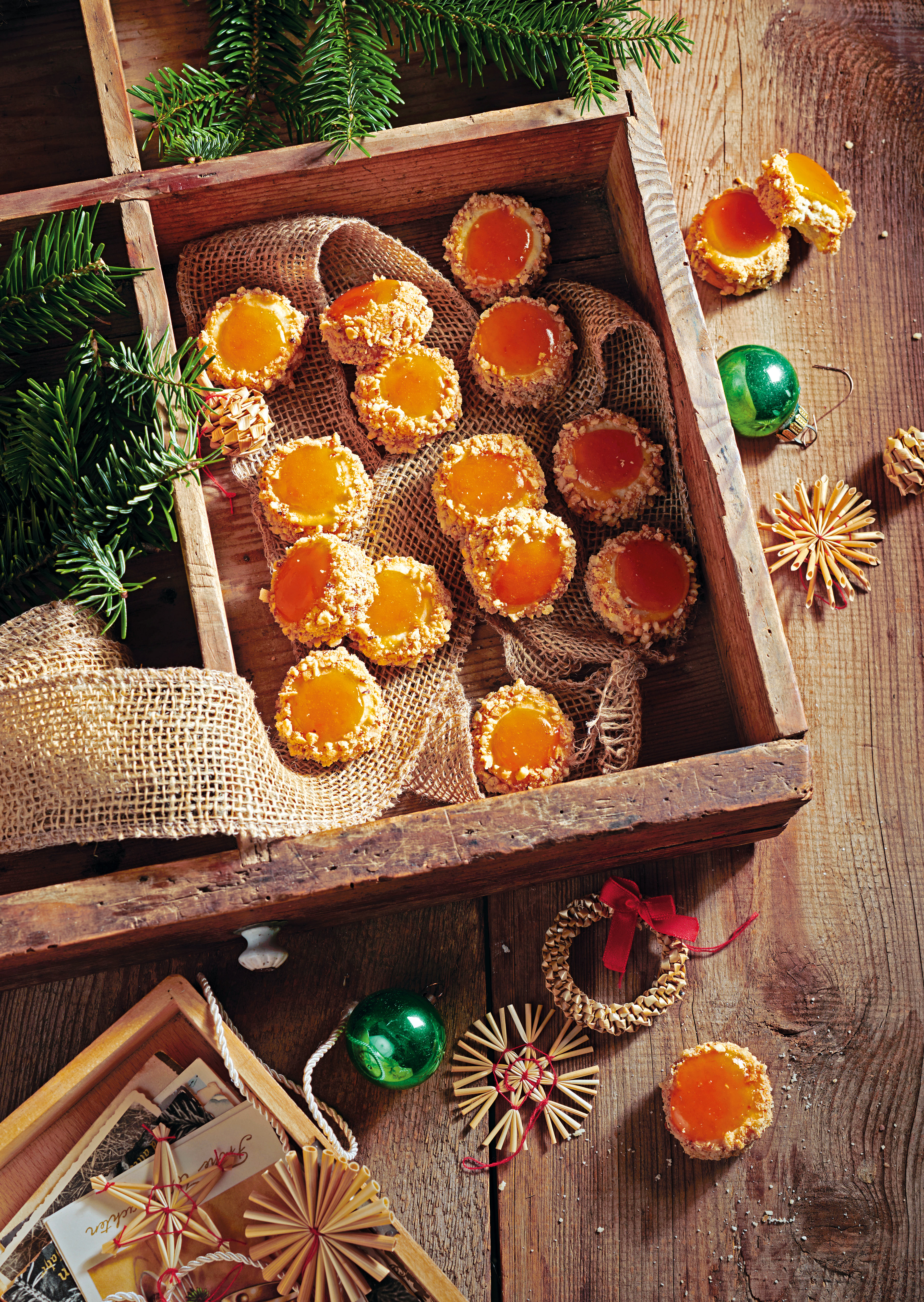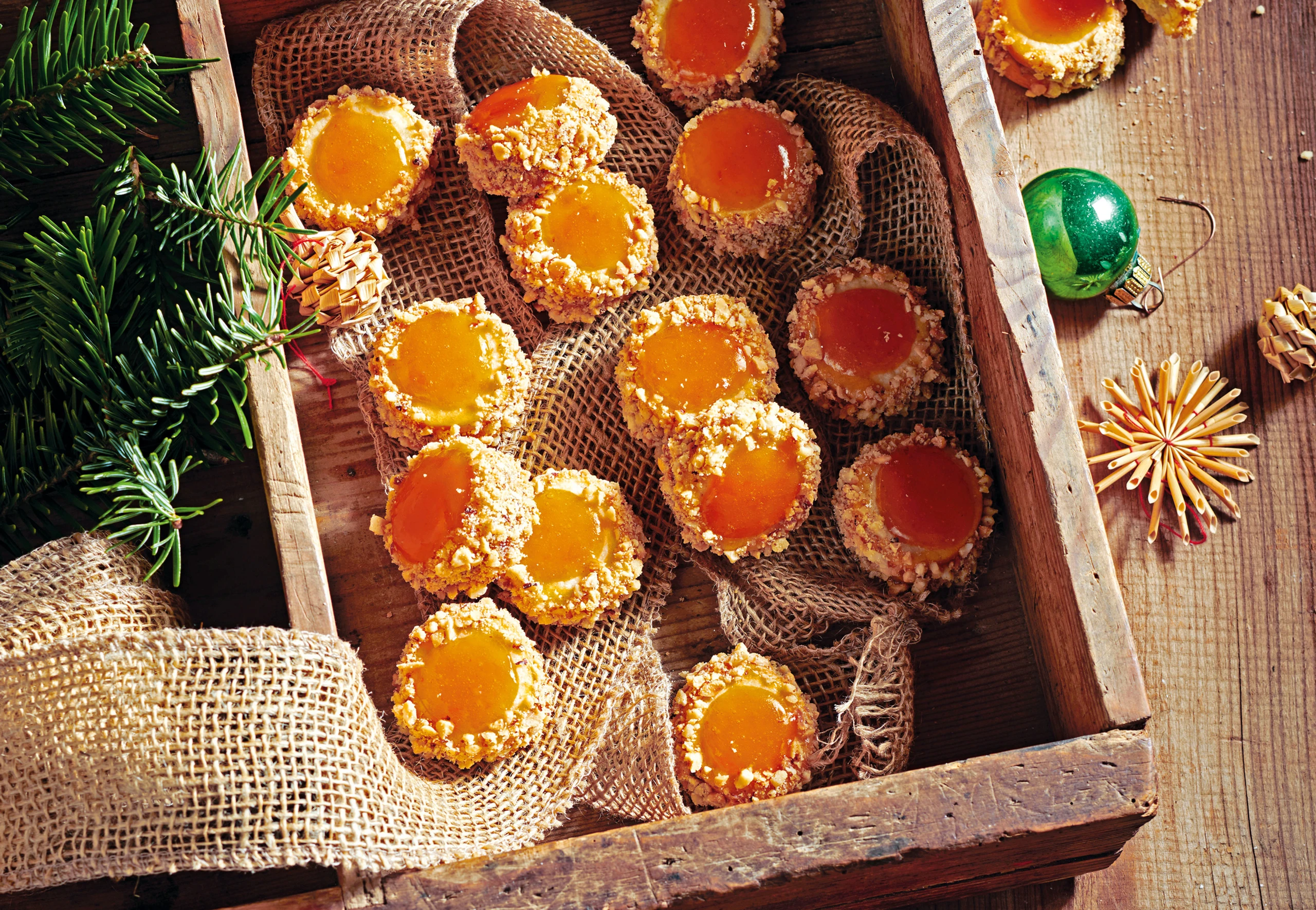 Die Hälfte der Kekse mit der Nussfülle bestreichen und mit den übrigen Keksen zusammensetzen. Marmelade aufkochen. Den Rand der Kekse vorsichtig durch die heiße Marmelade ziehen und in den gehackten Nüssen wälzen. Übrige Marmelade auf den Keksen verteilen und anziehen lassen.