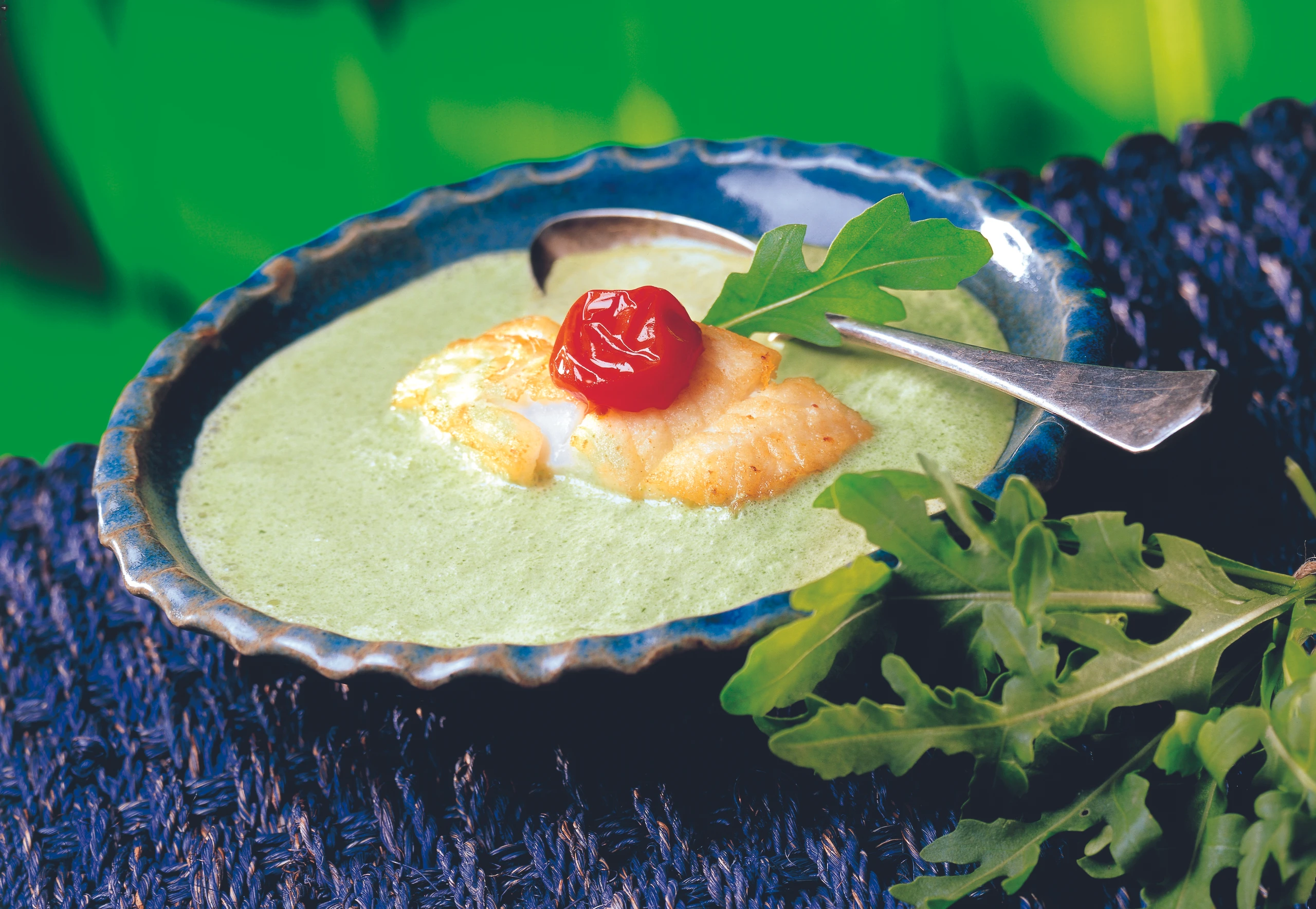 Rucola-Cremesuppe mit gebratenem Kabeljau